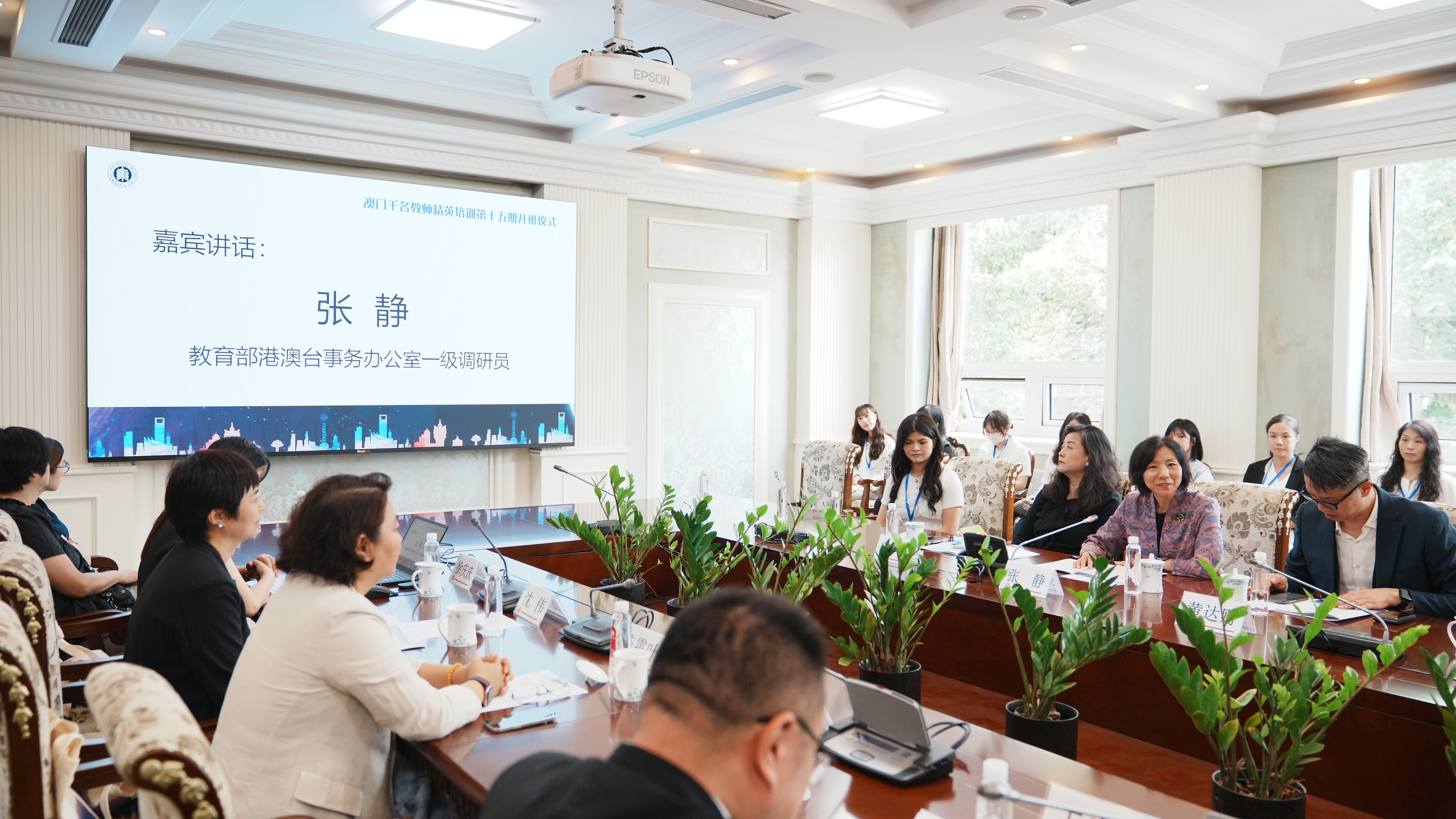 张静表示,港澳融入国家发展大局,纳入强国建设战略序列的步伐坚定,内地与港澳教育交流合作不断深入。“澳门千名教师精英培训计划”历经十四期的磨炼,已逐步成熟稳定。她提出三点期许:一是勇担时代责任,争做挺膺担当奋斗者;二是,拓宽国际视野,培育中外友好践行者;三是,增进互通互鉴,培育爱国爱澳传承者。希望学员积极发挥桥梁作用,推动内地与澳门优秀教育资源和宝贵实践经验互惠互通,传承爱国爱澳核心价值观,为教育强国建设凝聚一切积极力量。