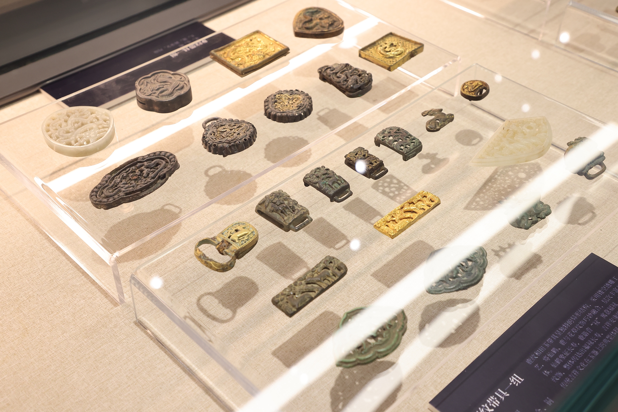 展览现场,每一件带具都力求“开口说话”。从考古发掘情况看,唐代玉带的题材比较丰富,有龙纹、胡人乐舞纹、狮子纹、瑞雀纹等。其中,胡人题材的流行与唐代社会对胡人乐舞文化的喜爱密不可分,彰显出唐代“兼收并蓄”的审美倾向,进一步反映了这一阶段民族融合的进程。