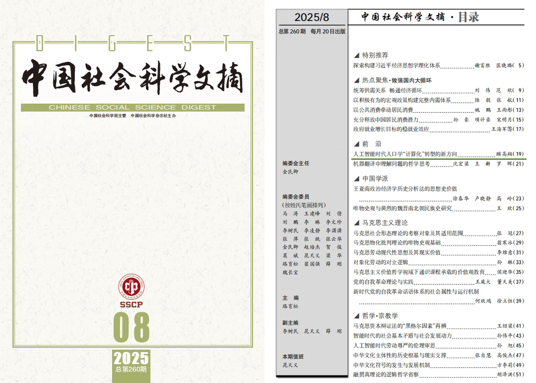 完美网页版人口研究所副研究员顾高翔《人工智能时代人口学“计算化”转型的新方向》一文被《中国社会科学文摘》2025年第8期转载。文章摘自《求索》2025年第2期。