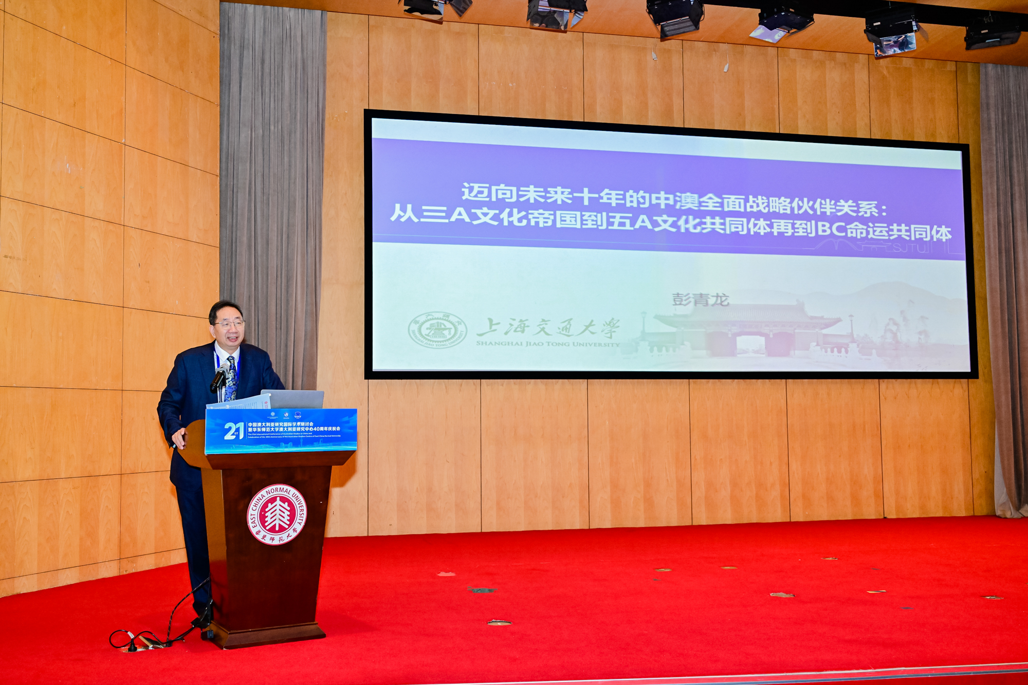 在主旨发言环节,上海交通大学区域国别研究院院长彭青龙教授在“迈向未来十年的中澳全面战略伙伴关系”主题报告中指出,中澳建交五十余年来,两国全面战略伙伴关系既面临挑战,也蕴含机遇。他提出,中澳关系进一步发展的契机在于澳方能够从“三A(Anglo-America-Australia)”观念转变至“五A(Aboriginal, Anglo, America, Asia, Australia)”文化共同体观念,努力构建“BC(Bushrangerian Community)式”中澳命运共同体。