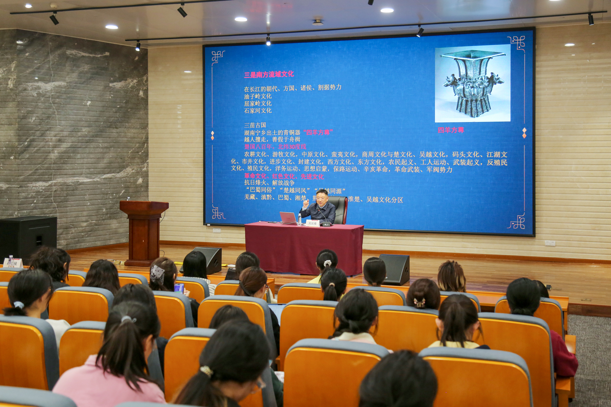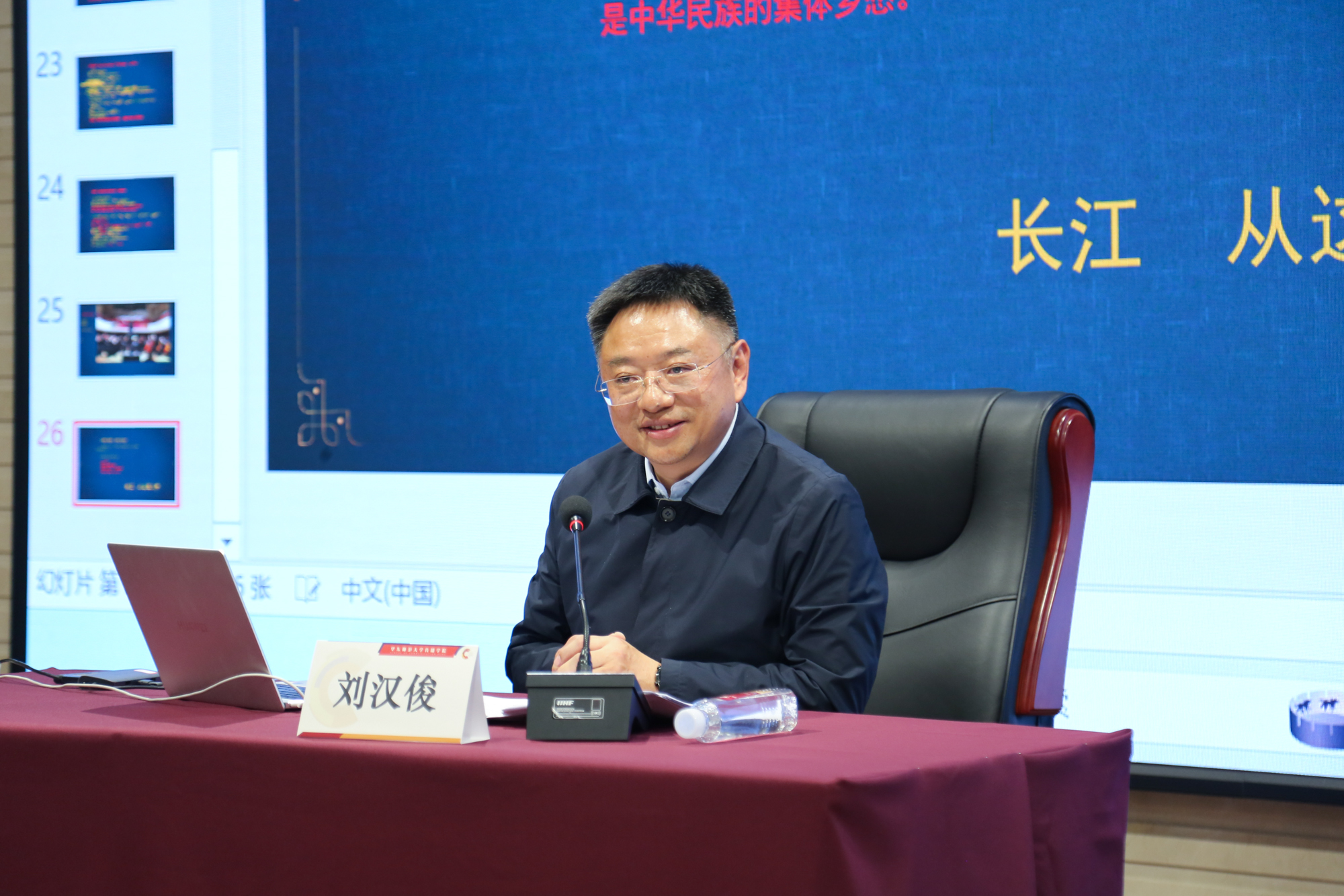 讲座伊始,刘汉俊提纲挈领地概述习近平文化思想要点,他追寻习近平总书记考察长江的足迹,重点阐述党的十八大以来,围绕长江经济带发展这一区域重大战略,习近平总书记主持召开了四次座谈会的重要精神。刘汉俊结合刚刚闭幕的党的二十届四中全会精神,重点讲解博大精深的长江文化,他从自然与文明的双重维度解读了长江的价值,将长江文化置于中华文明“二元结构”的宏大叙事中,以宏阔视野揭示了长江与黄河两大文化系统如何通过“互补、互敬、共生”,孕育出中华文明独一无二的韧性与活力。