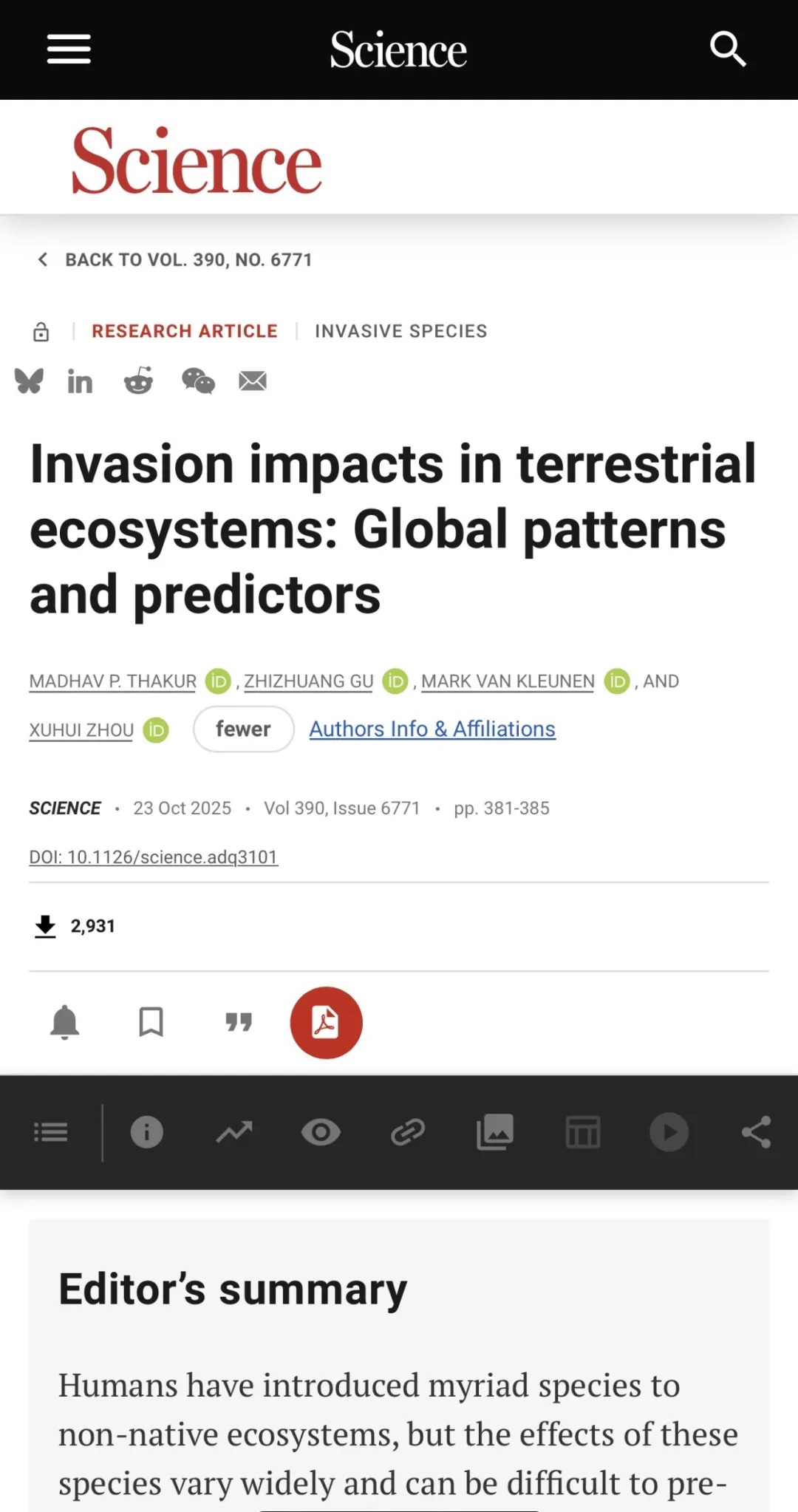 通过整合来自全球775篇实证研究、2223个效应量的数据,该研究揭示了入侵生物对生态系统的影响具有显著的情境依赖性(context dependency),即它们的生态效应并非固定,而是随着气候、植被类型、土壤特征以及入侵持续时间的不同而发生变化。