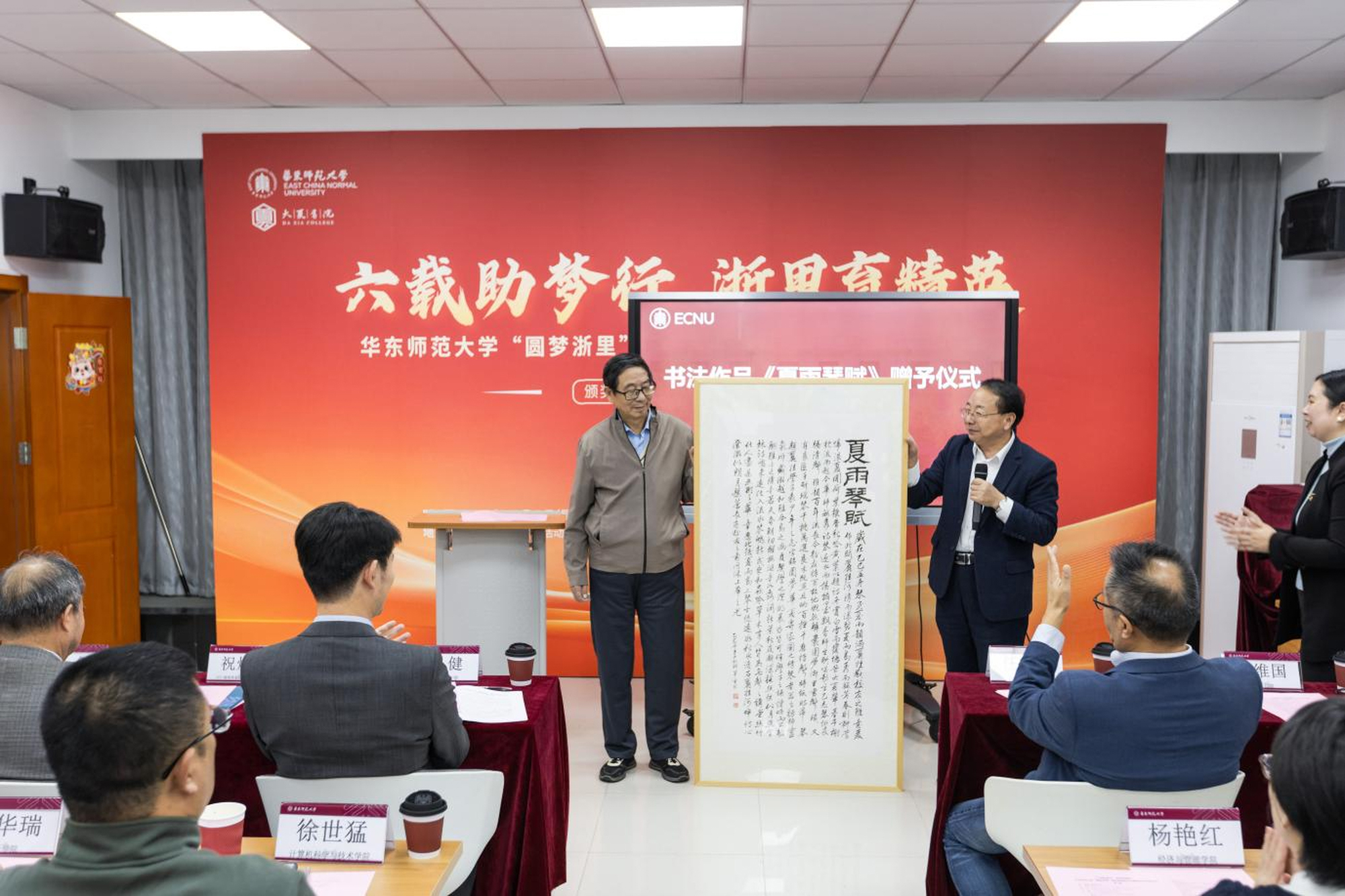 活动现场,中文系1977级校友董康定将书法作品《夏雨琴赋》赠予大夏书院。该赋由大夏书院学生课程主管、教育学部2022级本科生王子弘,在董康定校友与国际汉语文化学院成玮教授共同指导下完成,为活动增添了浓厚的传统文化气息,更见证着老中青三代携手献礼母校的师大情谊。