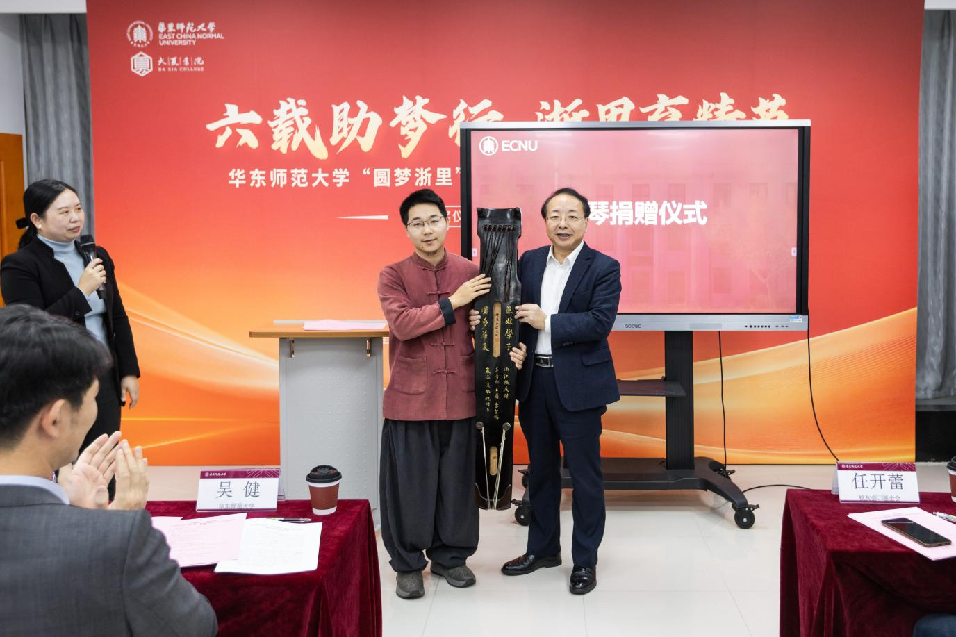 会上,大夏书院行政主管成海霞详细介绍了古琴捐赠情况,大夏书院院长庞维国代表书院接受捐赠。这把古琴由祝炜平、王青松、严正、王莉、凌敏、李贺鹏六位浙江校友联合出资购置,由国际汉语文化学院2019级校友何璞诗如的先生——国家级非遗传承人余建文亲手斫制,凝聚着校友对母校的真情感怀与美好祝愿。