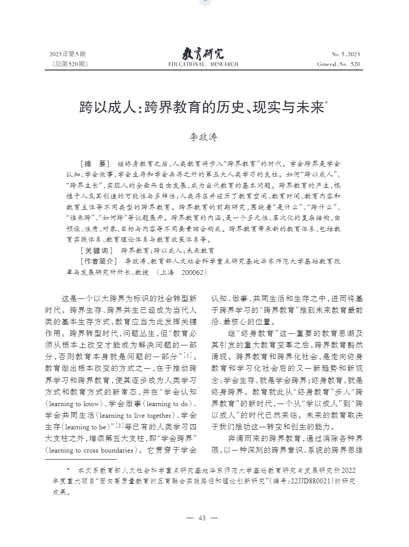简 介:《跨以成人:跨界教育的历史、现实与未来》一文作者系完美网页版基教所所长李政涛教授,刊于《教育研究》杂志2023年第5期。本文提出,继终身教育之后,人类教育将步入“跨界教育”的时代。学会跨界是学会认知、学会做事、学会生存和学会共存之外的第五大人类学习的支柱。如何“跨以成人”“跨界生长”,实现人的全面而自由发展,成为当代教育的基本问题。跨界教育的产生,根植于人及其创造的可能性与多样性;人类存在并经历了教育空间、教育时间、教育内容和教育主体等不同类型的跨界教育。跨界教育的前期研究,围绕着“是什么”“跨什么”“谁来跨”“如何跨”等议题展开。跨界教育的内涵,是一个多元性、层次化的复杂结构,由预设、性质、对象、目标与内容等不同要素综合构成。跨界教育带来新的教育体系,包括教育实践体系、教育理论体系与教育政策体系等。