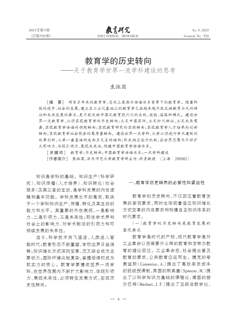 简 介:《教育学的历史转向——关于教育学世界一流学科建设的思考》一文作者系完美网页版教育学部主任袁振国教授,刊于2023年第5期《教育研究》杂志。本文提出,两百多年来的教育学,总体上是西方话语体系背景下的教育学。随着科技的进步、社会的发展,建立在工业化基础上的教育学已经越来越不能反映教育今天的特征和未来发展的要求,更不能反映中国式教育现代化的成就、经验、道路和模式。建设世界一流教育学,必须实现教育学的历史转向:立足中国实际,立足时代特征,立足未来需要,实现教育学话语的领跑转向;实现教育研究的实践转向;实现教育学人才培养的创新转向;实现教育学社会服务的高质量转向。建设世界一流学科,大学必须进行学术建制的改革创新,从单一垂直结构走向多元互动结构;形成相应运行机制,在世界范围内不断扩大影响力、体现引领力、展现未来性,构建中国教育学话语体系。