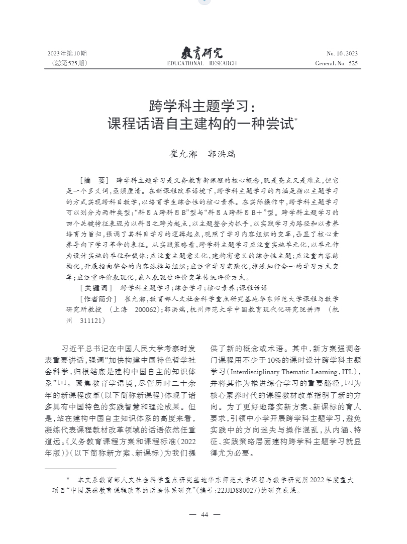 《跨学科主题学习:课程话语自主建构的一种尝试》