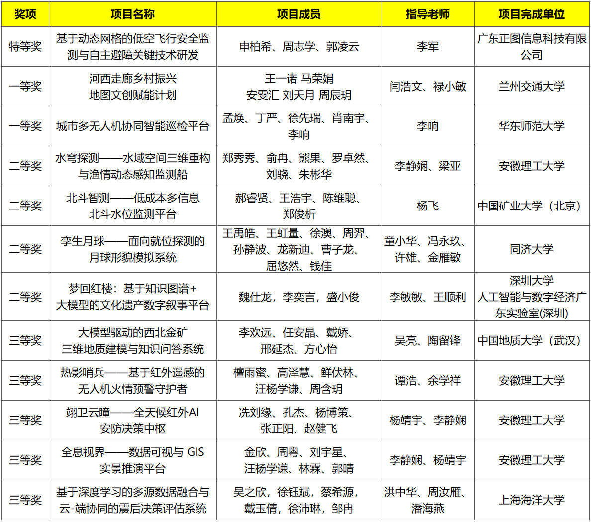 创新创业大赛答辩现场精彩不断,12支团队答辩项目涉及低空飞行、地图文创、智能巡检、三维地质建模、月球探测等多个领域。南京师范大学张书亮教授、南京大学程亮教授,以及上海众恒软件技术有限公司总经理王占宏、飞思达技术(北京)有限公司副总经理邹平、辛米尔视觉科技HRD&CEO助理叶骏等企业负责人,都对参加创新创业大赛的项目给予了充分肯定和建议,指出当前GIS已经成为一种整合数据、分析与决策的综合平台,通过各个团队的项目内容,体现了GIS已经在环境保护、应急管理、震后监测、文化遗产保护等多个领域深度融合,实现跨学科、跨部门的协同应用。评委们也指出创新创业大赛为大学生团队创业提供了一个很好的平台,希望看到更多团队能够在这个平台开始真正走向创新、创业,在市场实践中落地。最终经过激烈角逐,广东正图信息科技有限公司团队获大赛特等奖,兰州交通大学团队与完美网页版团队获大赛一等奖。