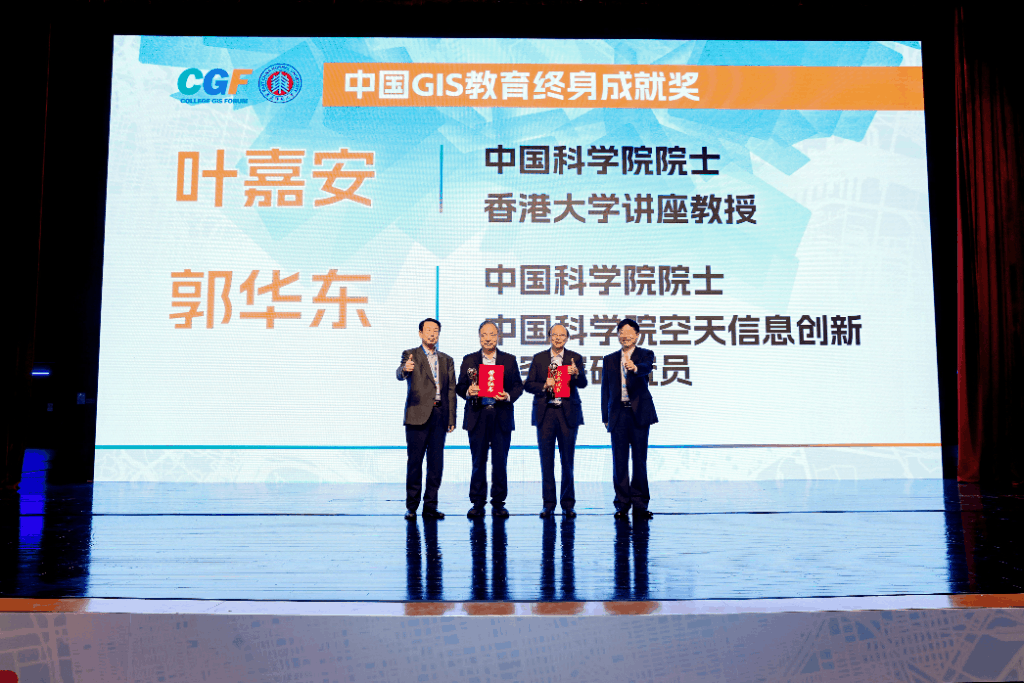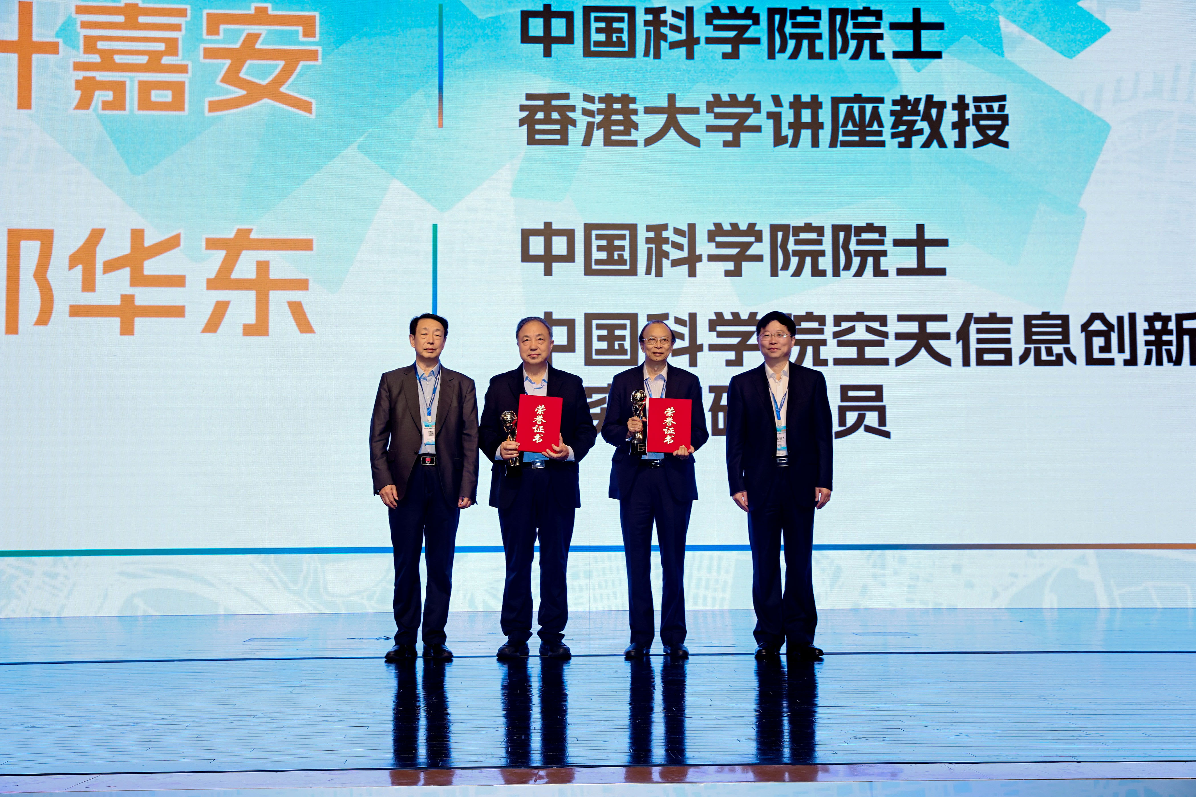 中国测绘学会副理事长兼秘书长张绍杰、中国卫星导航定位协会会长于贤成为中国科学院院士、香港大学叶嘉安教授,中国科学院院士、中国科学院空天信息创新研究院郭华东研究员颁发了本届“中国GIS教育终身成就奖”荣誉证书及奖杯,表彰他们为我国地理信息教育事业所做出的卓越贡献,培养了大量杰出人才。叶嘉安院士、郭华东院士现场发表获奖感言,分别总结了自己的科研教育经历,表达了对地理信息学科后继者的鼓励与期许。
