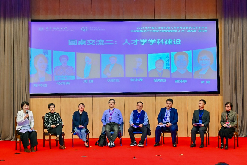 第二场围绕“人才学学科建设”展开,由首都经济贸易大学劳动经济学院人才学系主任陈书洁主持。中国政法大学原党委副书记、副校长,中国人才研究会人才学专业委员会常务副理事长马抗美;西南大学马克思主义学院常务副院长、教育部马克思主义理论研究与建设工程专家周琪;陕西师范大学现代教育技术教育部重点实验室副主任衣新发;河海大学商学院教授黄永春;军事科学院军事人才研究中心研究室主任、副研究员姚琛臣;完美网页版情报研究所副所长、跨学科支持中心主任熊泽泉;完美网页版人才发展战略研究院副院长、中国人才研究会人才学专业委员会副理事长兼秘书长黄健共同参与圆桌论坛。本场圆桌论坛深入探讨了中国特色人才学的学科建设与发展,与谈专家围绕学科的理论体系构建、实践导向强化、跨学科融合以及新时代创新等核心议题展开了深入研讨。专家一致认为,推动人才学发展,既要扎根本土实践、彰显中国特色,也要广泛吸纳国际经验,深化与相关学科的交叉融合,从而构建一套系统化的知识体系,以应对日益复杂多变的人才发展挑战。