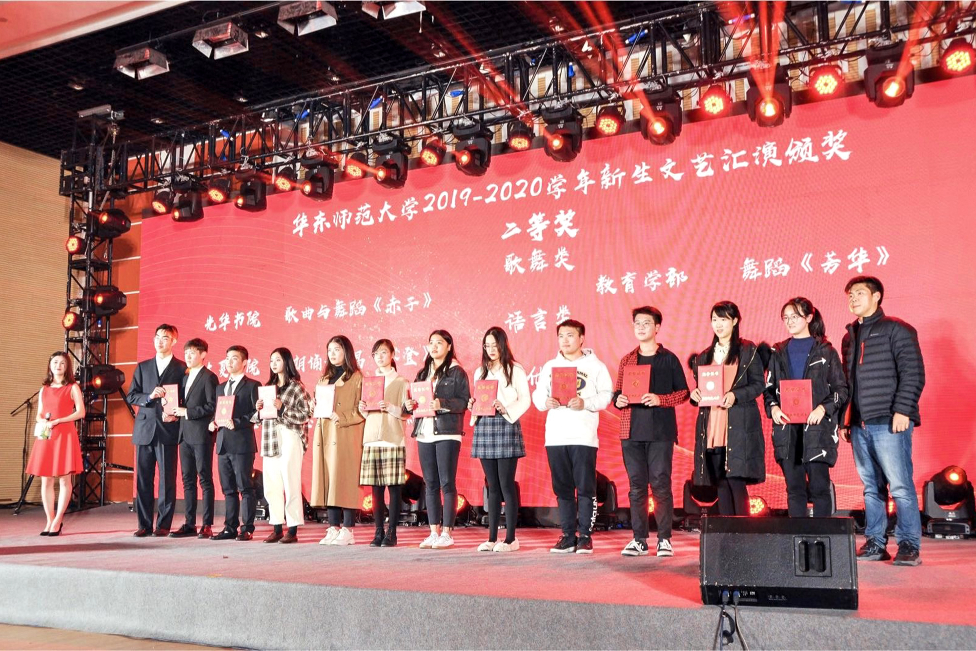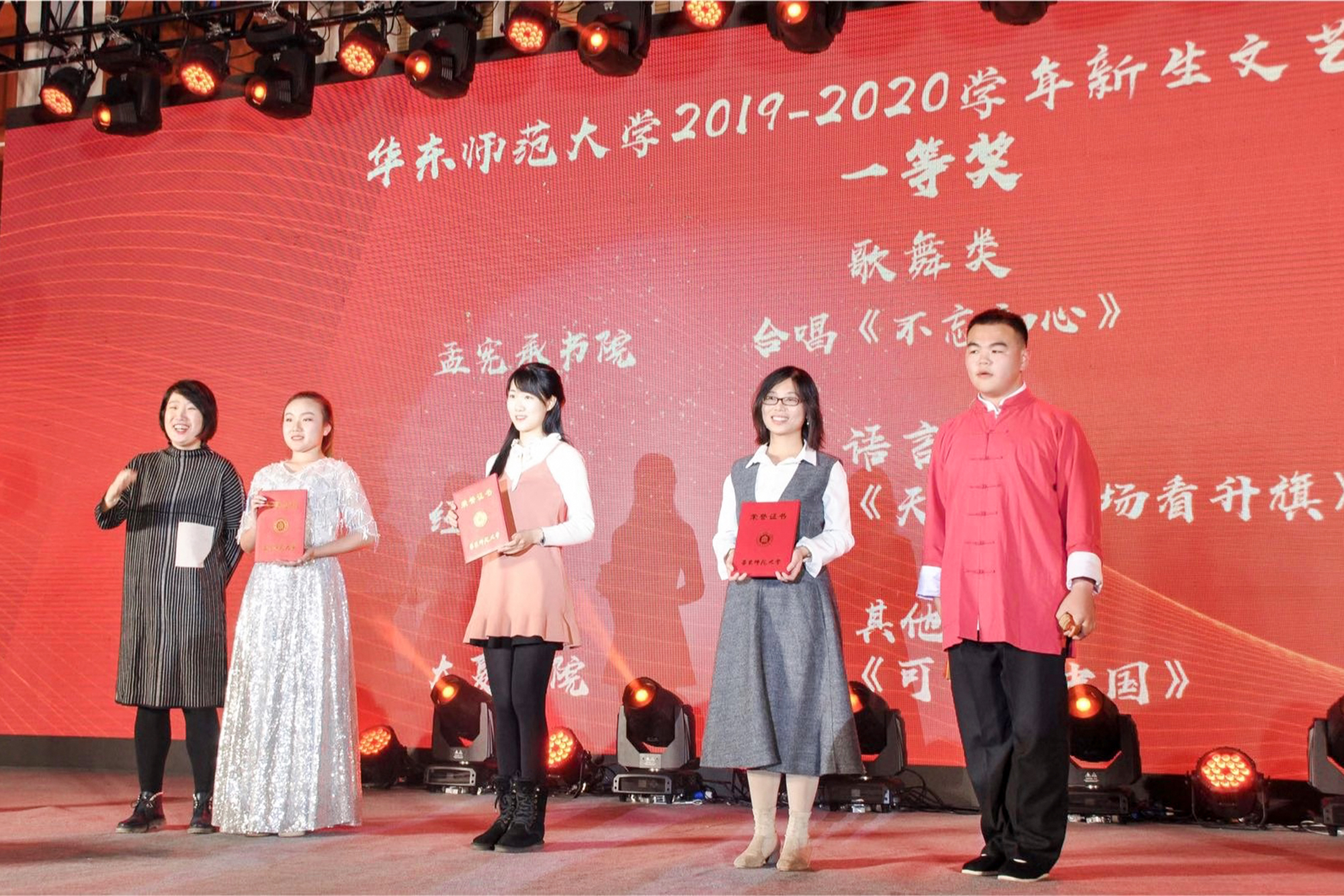 在2019年新生文艺汇演中,孟宪承书院、经管书院、大夏书院带来的节目获各类别节目一等奖。光华学院、教育学部、大夏书院、音乐学院带来的节目获各类别节目二等奖。美术学院、经管书院、外语学院、中国语言文学系、体育与健康学院以及国际汉语文化学院荣获各类别节目三等奖。
