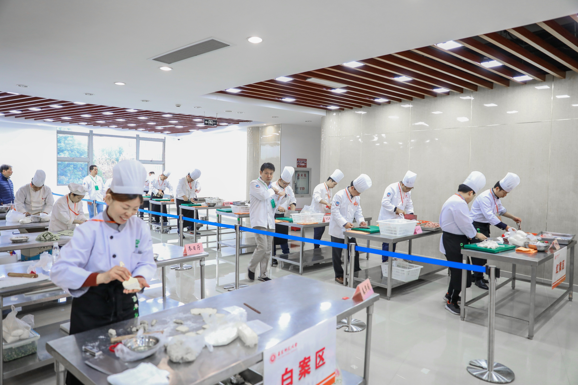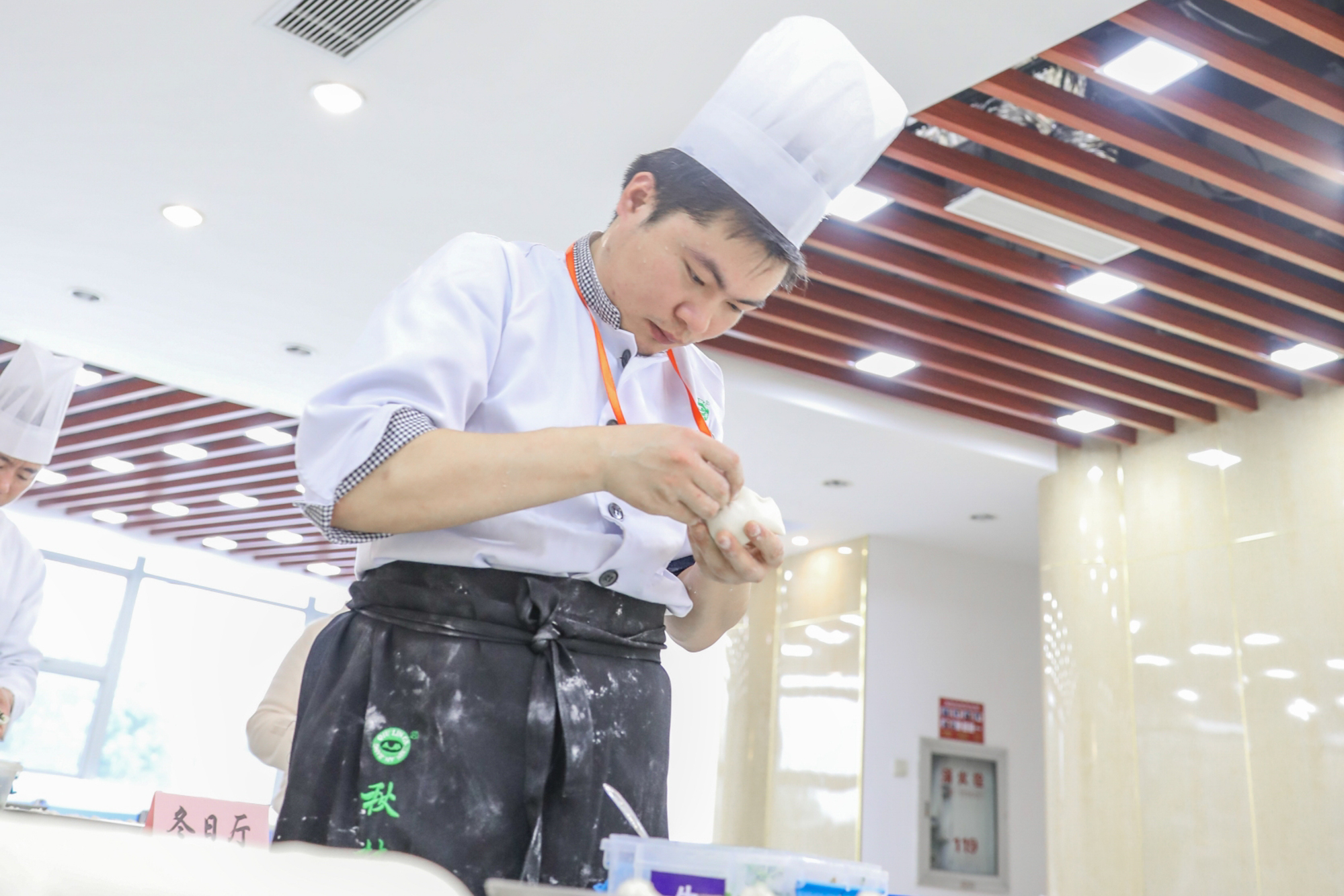 赵健宣布2019年学生食堂厨艺技能比赛正式开始。两校区春华阁、夏雨厅、秋实阁、冬月厅、冬日厅、丽娃食堂、河西食堂、河东食堂8个基本伙食餐厅厨师和点心师(指定菜、指定点心的参赛厨师和点心师由后勤保障部在比赛前随机抽取)组成代表队参赛。根据比赛规程,各代表队要在90分钟规定时间内完成6道菜(红案和白案各3道)的操作,参赛选手从每道菜的切配、上灶烹饪到出品等工序都要求独立完成,在刀功、调味、色泽、口感、营养等方面考量选手的厨艺技能水平。比赛中,参赛选手们精神饱满,胸有成竹、有条不紊、动作娴熟、各显其能,充分发挥了自己的精湛厨艺。