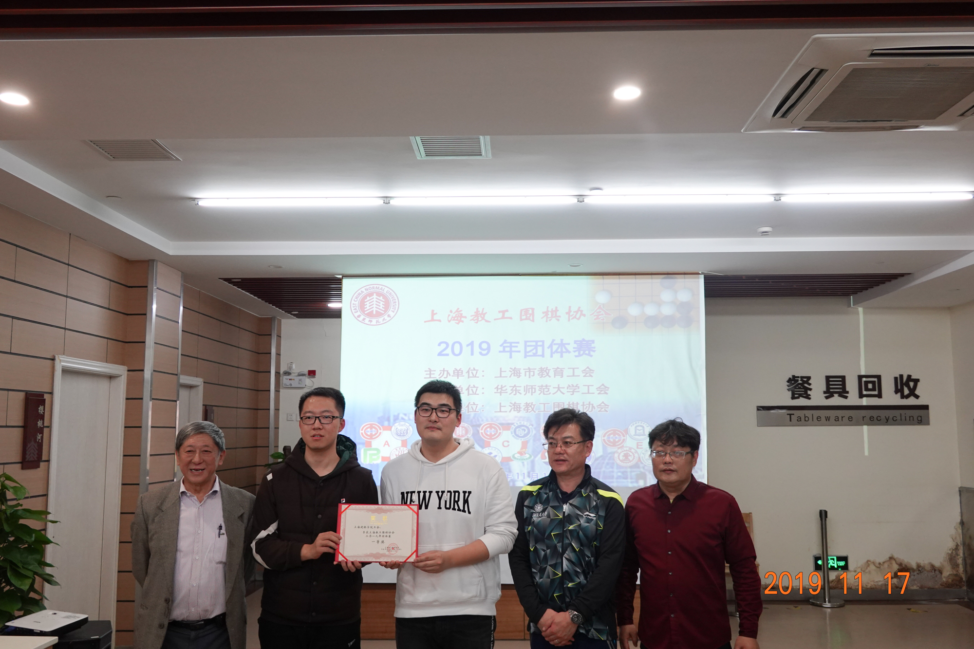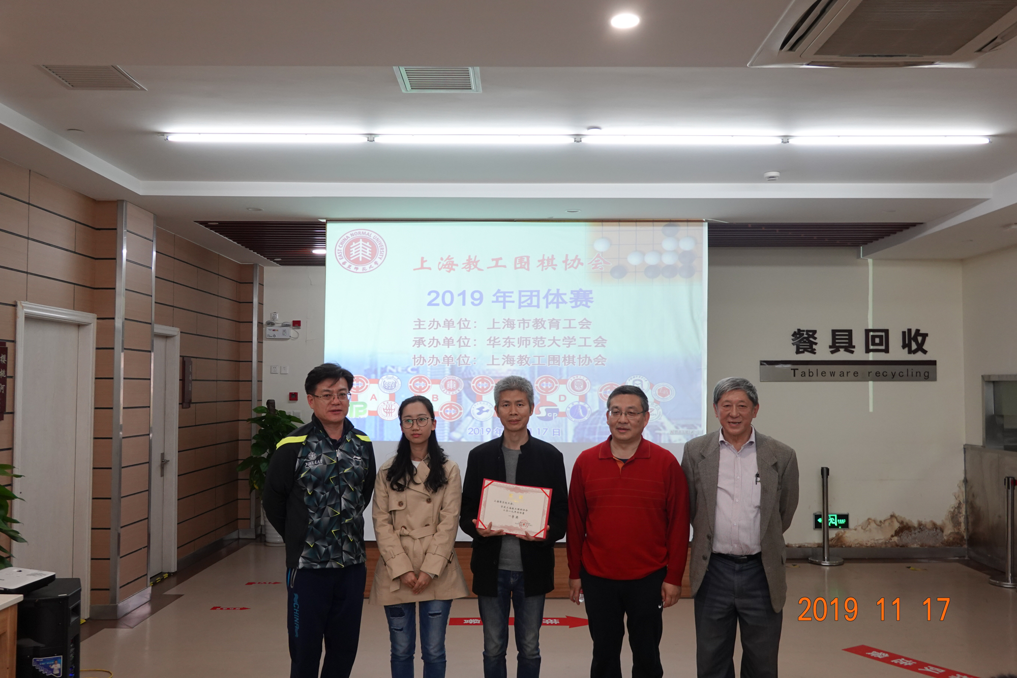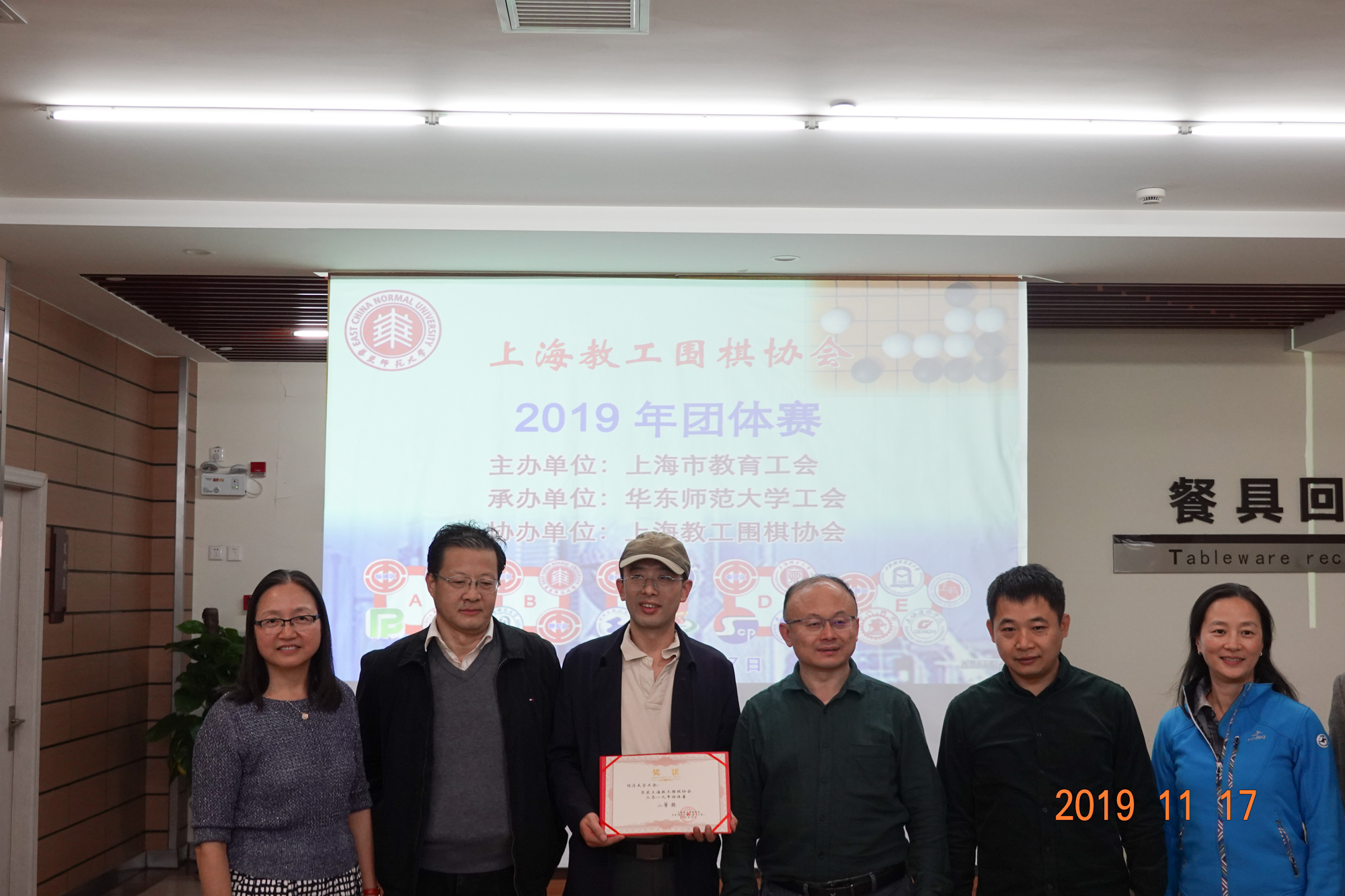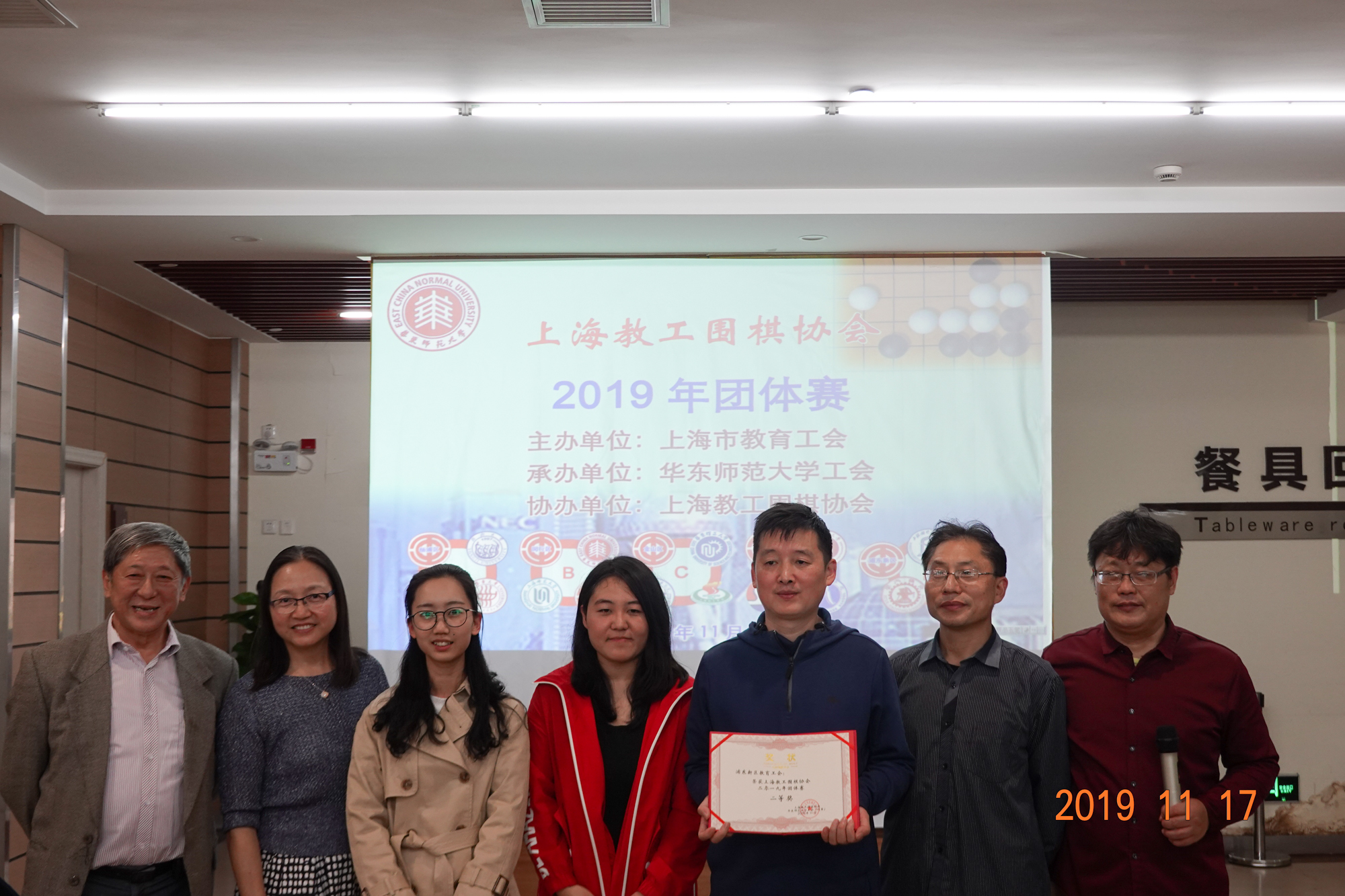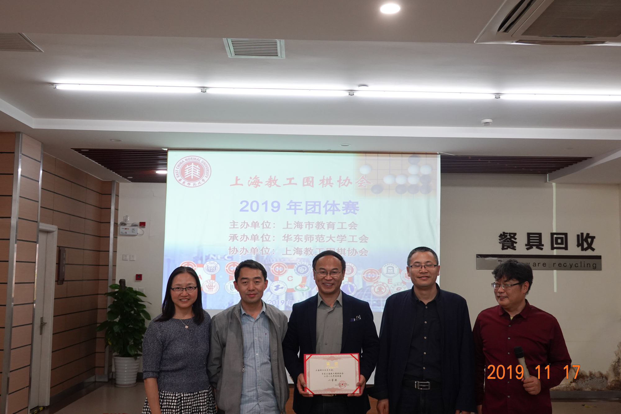 颁奖仪式上,上海教工围棋协会会长赵文庆、上海交通大学工会主席于朝阳、完美网页版工会常务副主席王平、完美网页版工会副主席李小英、静安区教育工会副主席李擎分别为获奖团队颁发奖状。