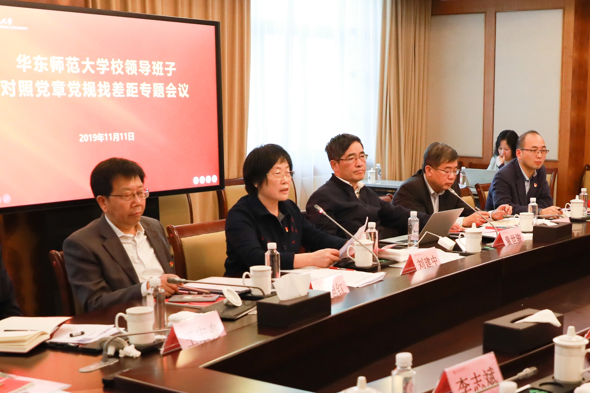 会上,童世骏、钱旭红、朱明、王宏舟、杨昌利、曹友谊分别领学《中国共产党章程》《关于新形势下党内政治生活的若干准则》(以下简称“准则”)《中国共产党纪律处分条例》(以下简称“条例”)相关内容。与会校领导认真对照党章重点查摆的5个方面问题、《准则》重点查摆的8个方面问题、《条例》重点查摆的5个方面问题,结合分管工作和学校实际进行自我检查,全面查找违背初心和使命的问题,既回答了有没有问题,又对存在的问题进行了剖析。班子成员之间还进行了相互提醒。