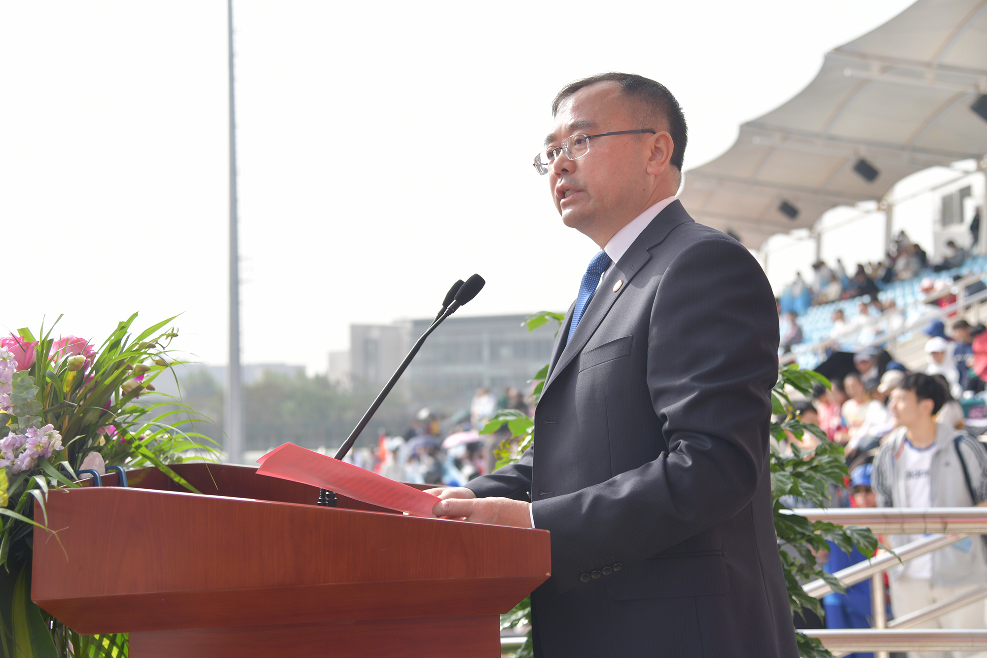 校党委副书记杨昌利宣布运动会开幕。奥运选手、国家田径队队员、体育与健康学院2016级运动训练学专业葛曼琪同学和体育与健康学院院邱进宇老师分别作为运动员、裁判员代表宣誓。之后,各学部院系学生与教工代表队分别进行了第九套广播体操比赛。