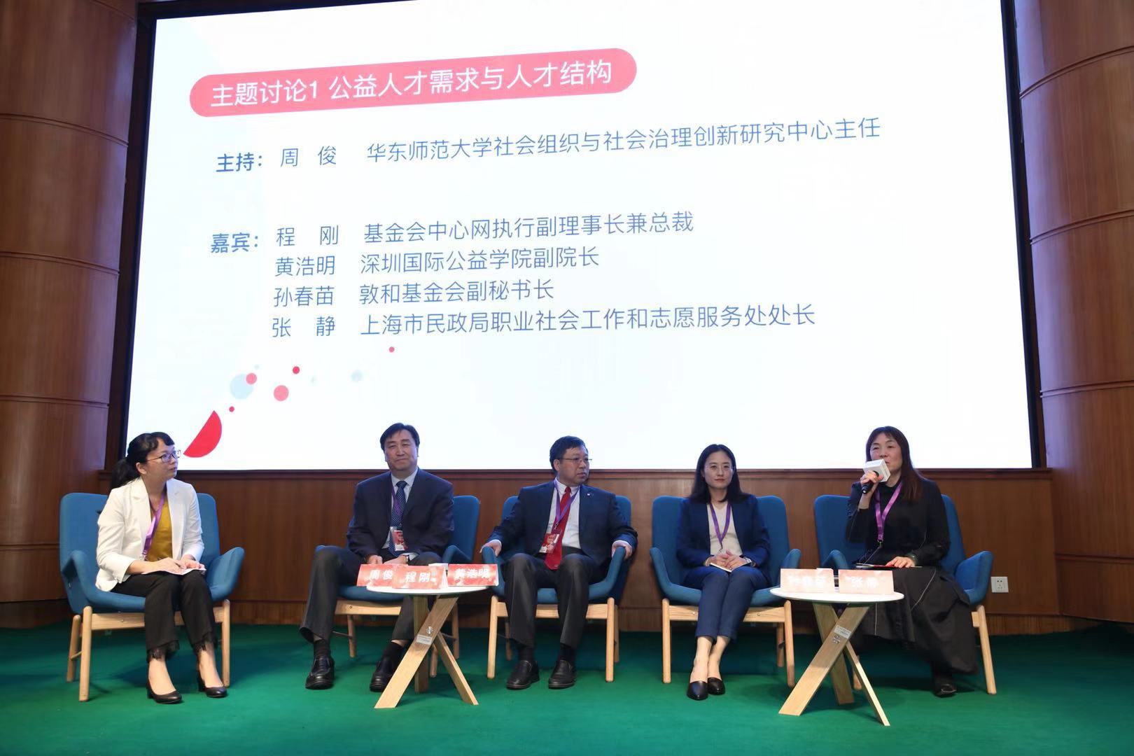 第一场主题讨论为“公益人才需求与人才结构”。基金会中心网执行副理事长兼总裁程刚、国际公益学院副院长黄浩明、敦和基金会副秘书长孙春苗、上海市民政局职业社会工作和志愿服务处处长张静参与了主题讨论。活动在学校社会组织与社会治理创新研究中心主任周俊的主持下正式开始。四位嘉宾分别从公益机构、研究机构与政府的角度,围绕当前我国公益领域的人才状况、人才需求以及人才培养方面的作为等展开了热烈的讨论。