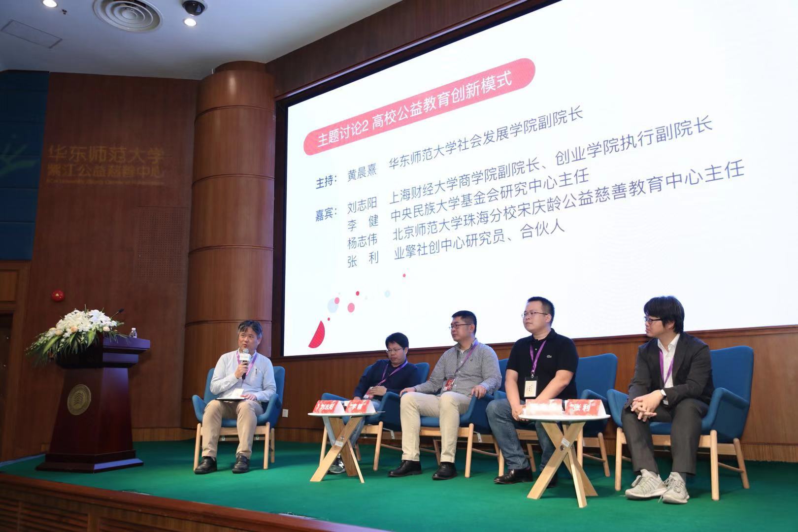 第二场主题讨论围绕“高校公益教育创新模式”展开。上海财经大学商学院副院长、创业学院执行副院长刘志阳,中央民族大学基金会研究中心主任李健,北京师范大学珠海分校宋庆龄公益慈善教育中心主任杨志伟,业擎社创中心研究员、合伙人张利参与了第二场讨论。我校社会发展学院副院长黄晨熹主持了此次讨论。嘉宾们各自分享了自己对于高校公益教育创新模式的看法。高校公益慈善教育的政策创新、课程创新、技术创新、人才培养方式的创新是嘉宾们提到频率最高的词汇。