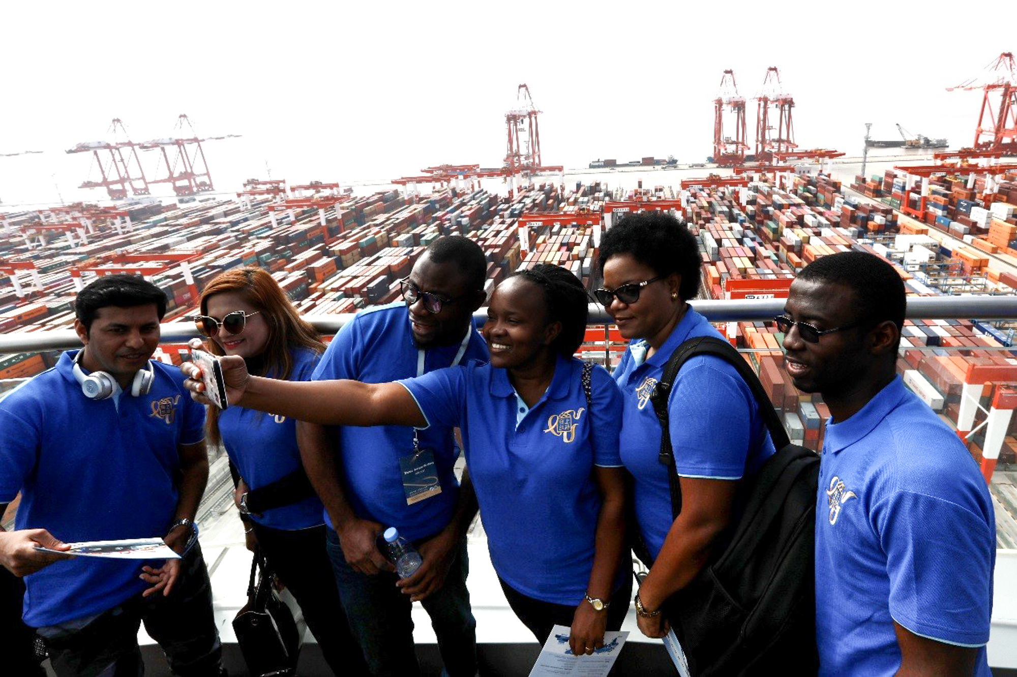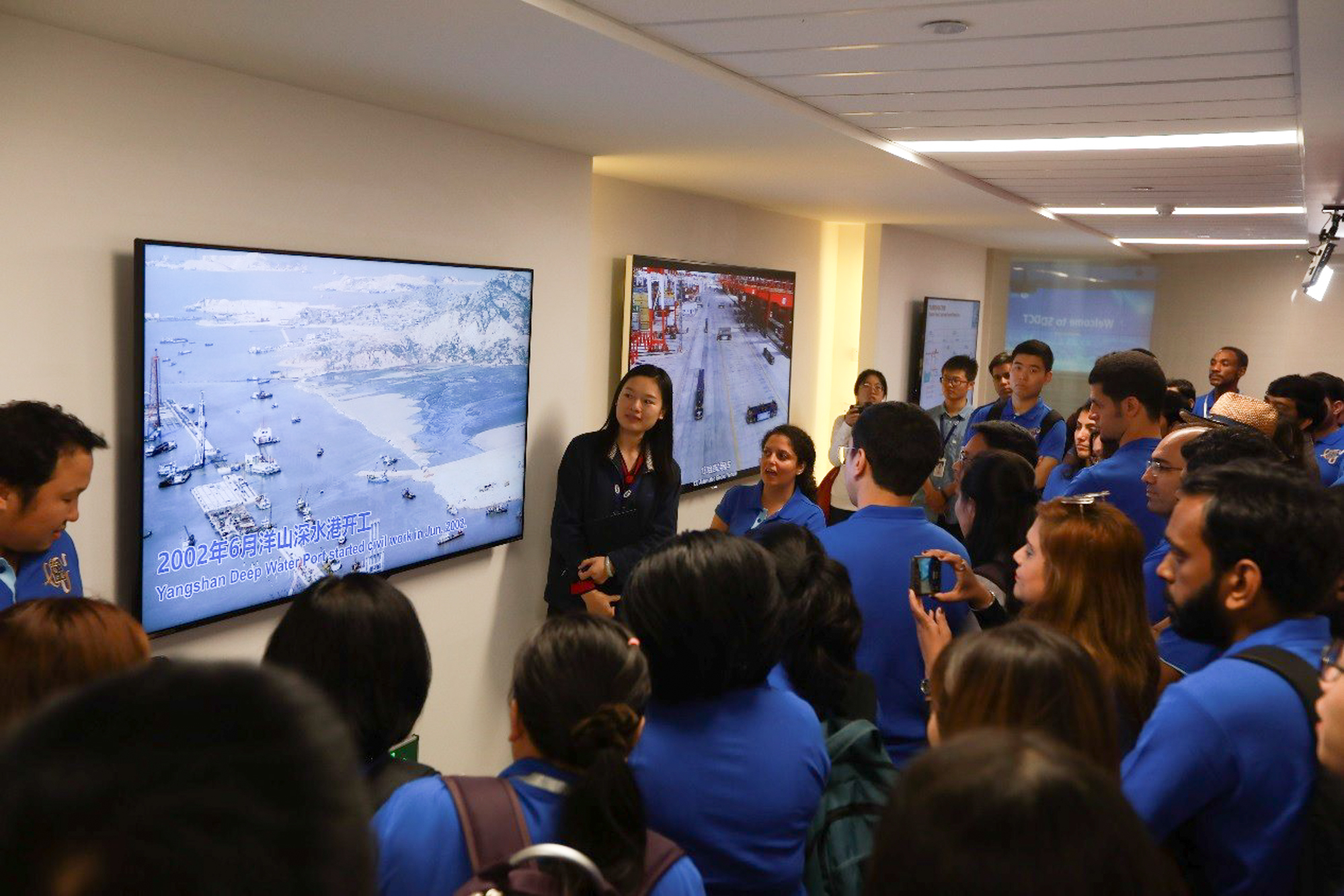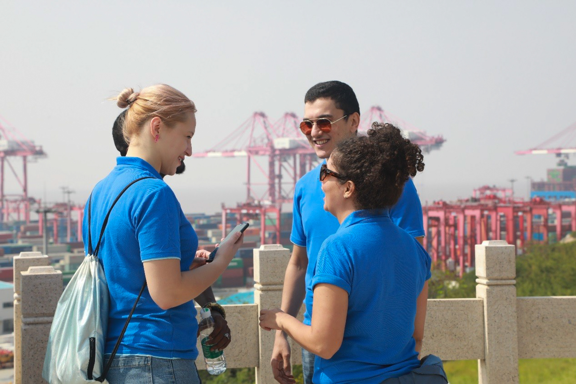 本次论坛的特色是学术交流与实地体验相结合。上海是中国最大的港口城市,位于海上丝绸之路和长江经济带的交汇点。洋山深水港作为上海国际航运中心建设的核心工程和中国(上海)自由贸易试验区的重要组成部分,2005年开港运营,助力上海港集装箱吞吐量自2010年起连续稳居世界第一。10月12日,跨过32.5公里的东海大桥,学生们来到洋山深水港区进行实地考察。在上海国际港务(集团)股份有限公司尚东分公司党委书记沈淼、党群工作部主任朱燕娜、团委书记孙知欣的接待下,学生们参观了四期自动化码头—全球规模最大的自动化集装箱码头。站在17层的瞭望台上,海风拂面,数公里的码头岸线尽收眼底,学生们被这充满现代感科技感的宏大工程所震撼,连连赞叹中国制造的智慧与伟大,深切地感受到了上海与世界的联通。
