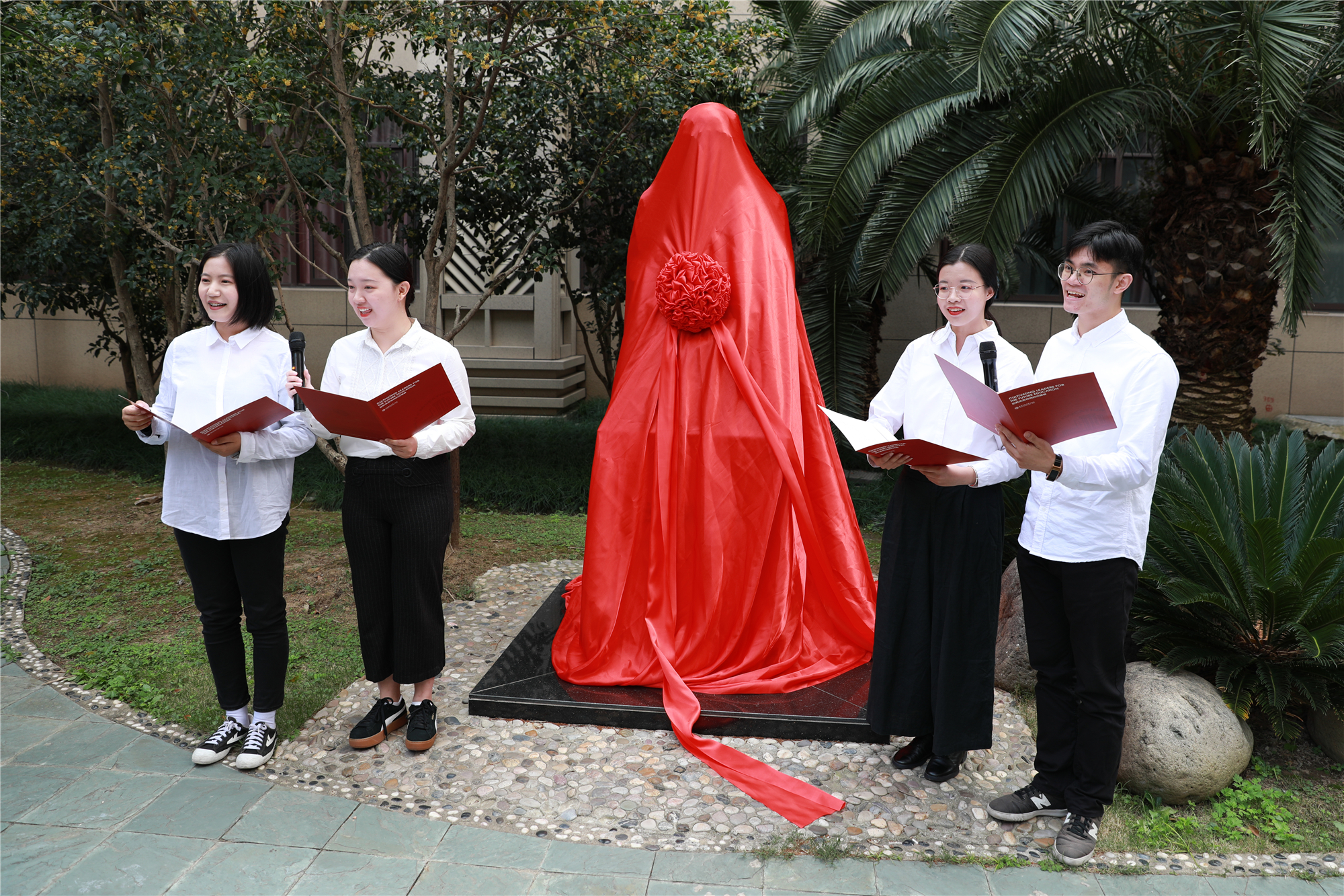 随后,与会人员移步至文科大楼中庭,举办了简短而隆重的刘佛年雕像揭幕仪式。2019级“佛年班”同学们通过原创诗朗诵《传承佛年志》表达了对刘佛年校长的缅怀和纪念。诗歌讲述了刘佛年校长寒窗苦读、辗转求学、涵育英才、改革创新的人生历程,以及他追求真理、鞠躬尽瘁、胸怀天下的教育家精神,表达了新一代“佛年人”“求实求精,求活求新,做未来教育的领导者”的决心。胡卫与童世骏共同为刘佛年雕像揭幕,“佛年班”学生代表向刘佛年雕像献上鲜花。