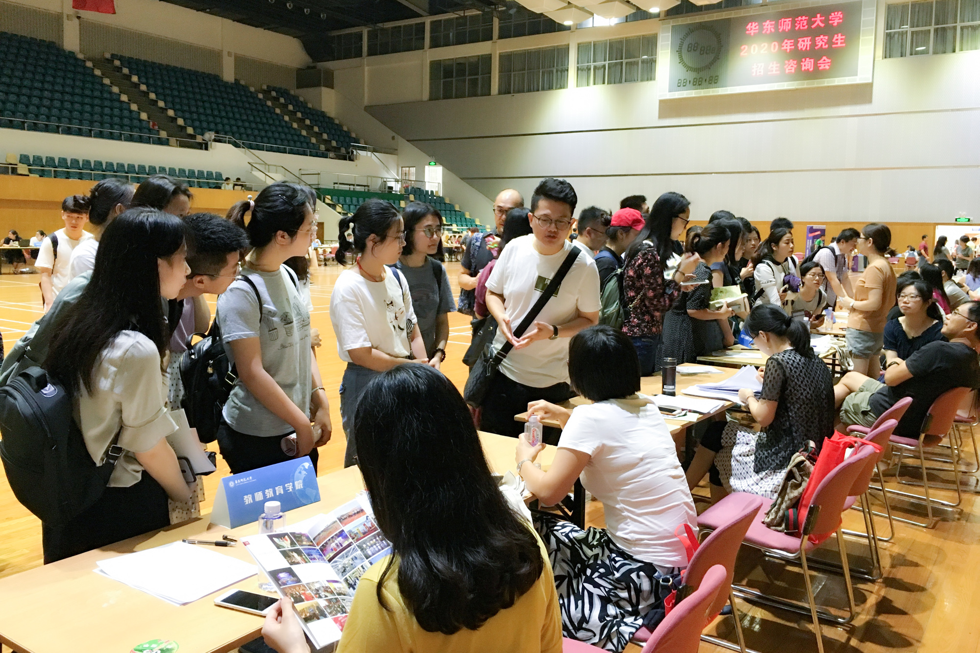 9月8日上午,我校在中山北路校区体育馆举办了2020年研究生招生现场咨询会。咨询会现场吸引了来自我校、复旦大学、上海交通大学、同济大学、华东理工大学、上海大学、上海师范大学、东华大学、华东政法大学、上海外国语大学、上海海洋大学等上海市高校和其它省市40多所高校的应届和往届毕业生,还有目前在国外就读学生以及往届考生。我校各院系和研究生院近百名工作人员,围绕考生关注的热点问题进行了面对面的专业解答,总计接待咨询超过五百人次。