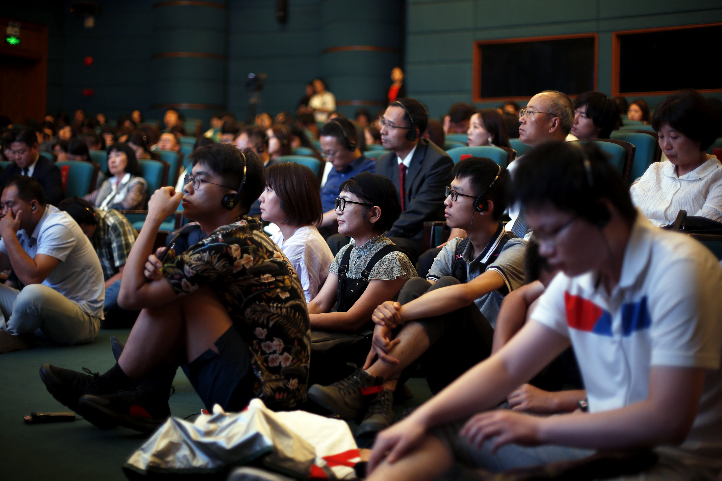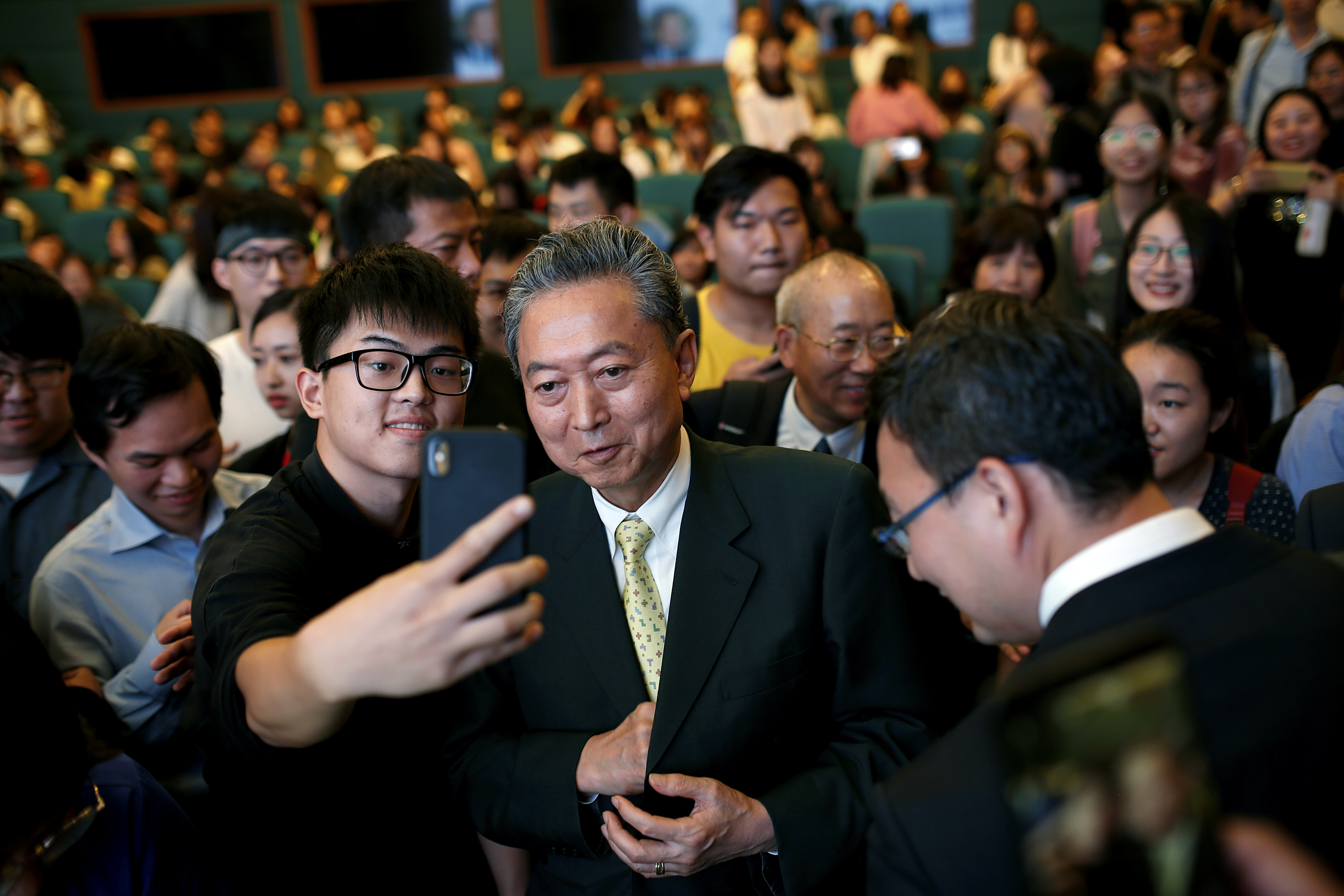 “大家的热情是充满诚意的,我感到十分幸福!我的夫人鸠山幸在上海出生。上海对我们来说,是有特别情感的地方,在这里演讲,我真的感到非常幸福。”15时半,鸠山由纪夫准时出现在报告厅,一开场与满座的师生用日语互问“你好!”。