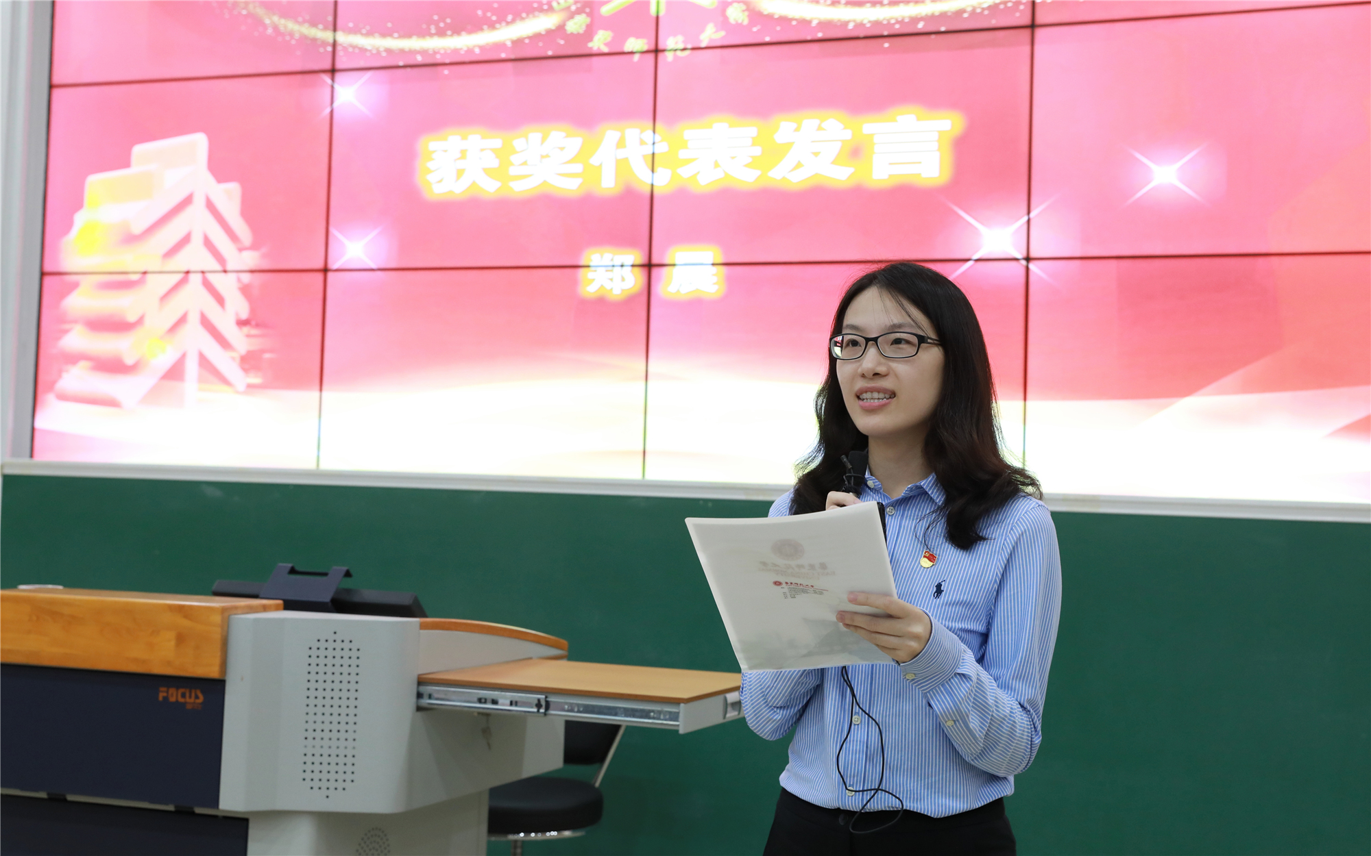 大赛一等奖获得者,来自学校办的郑晨代表获奖人员发言。她首先感谢学校领导对机关青年的重视和关心,感谢大赛的组织单位,并表示自己作为一名机关管理人员的初心就是快乐幸福的工作和生活。她还以意识、态度、能力和责任等四个关键词,和大家分享如何成为一名优秀的机关管理人员的体会和感受。