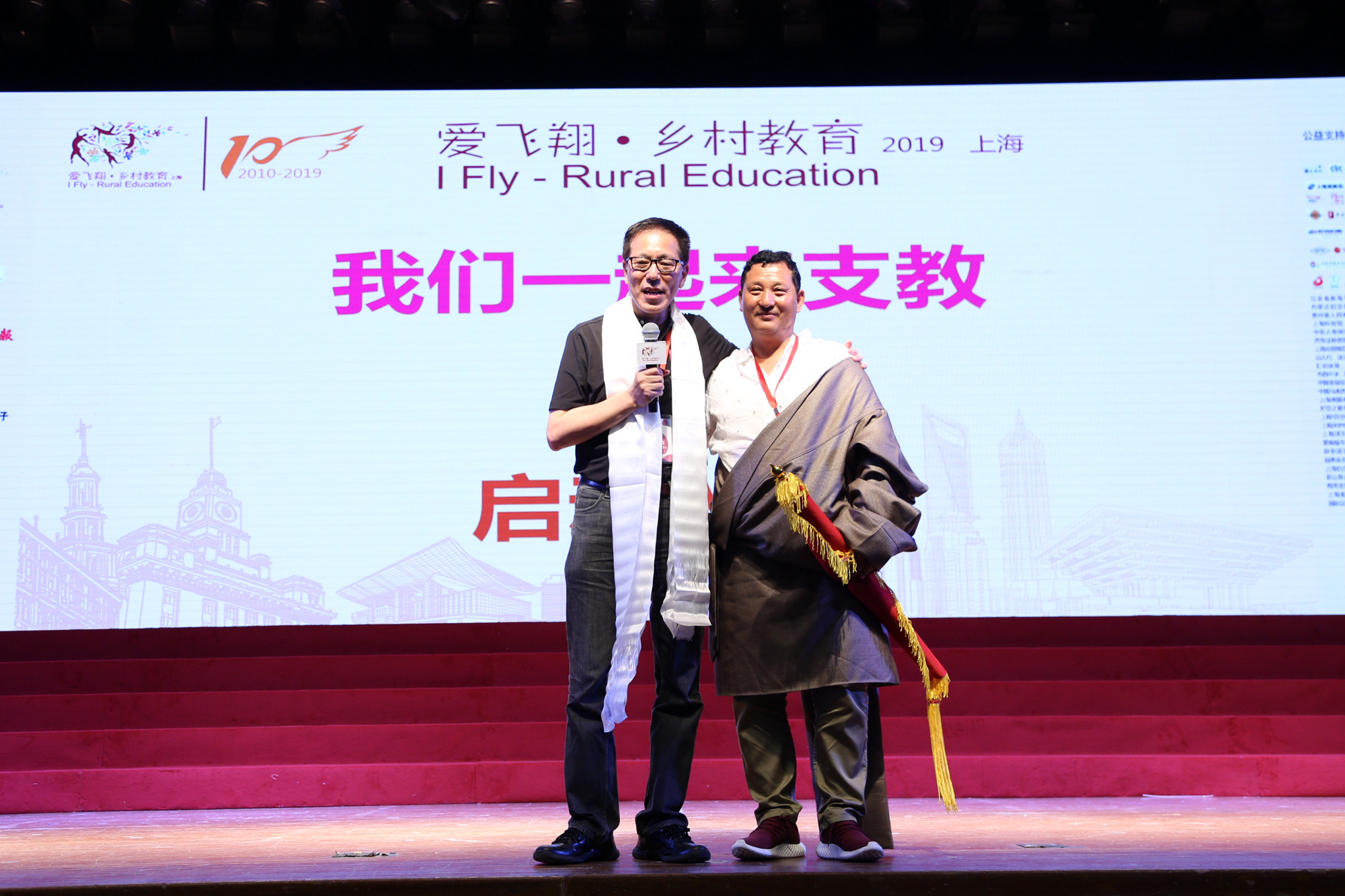 俄尖尼玛也来到了活动现场,现场热烈的掌声和感动的泪水是对他最好的回馈。俄尖尼玛还与资深志愿者方桢女士、9位市民家庭代表共同启动了“爱飞翔”“我们一起来支教”项目。