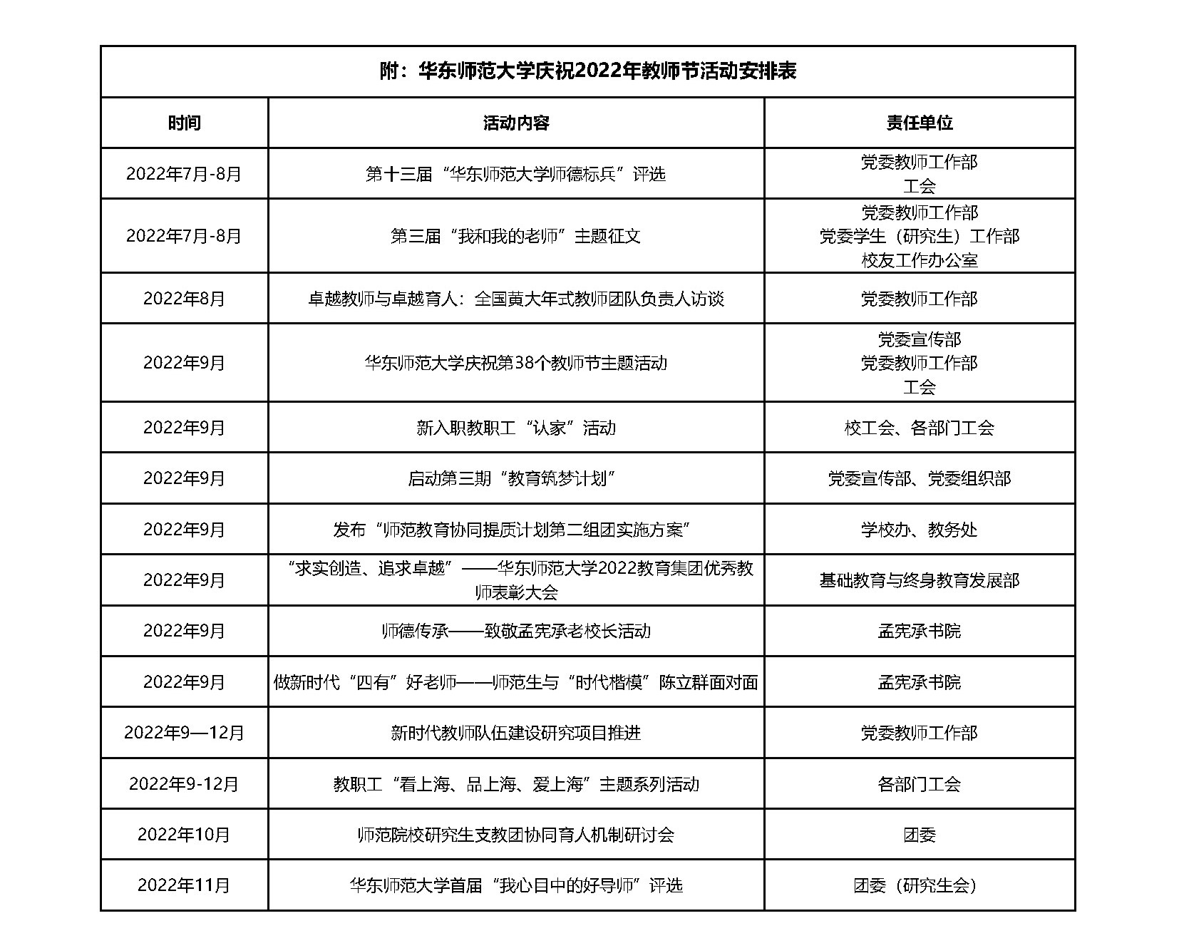 各单位要及时做好工作总结,并于9月30日(周五)前,以图文的形式将相关活动的开展情况报送党委教师工作部,电子版文档发送至jsb@admin.ecnu.edu.cn。