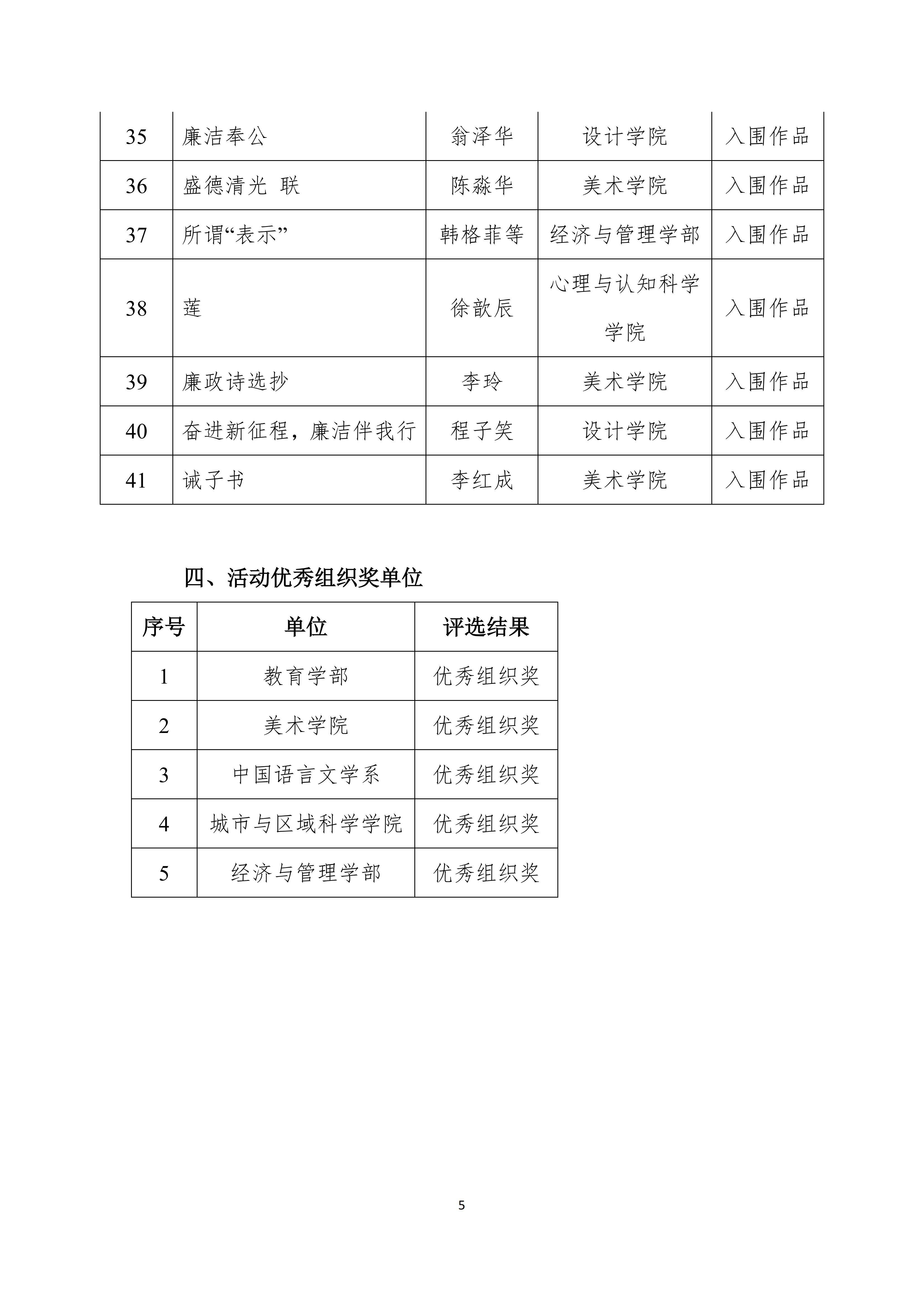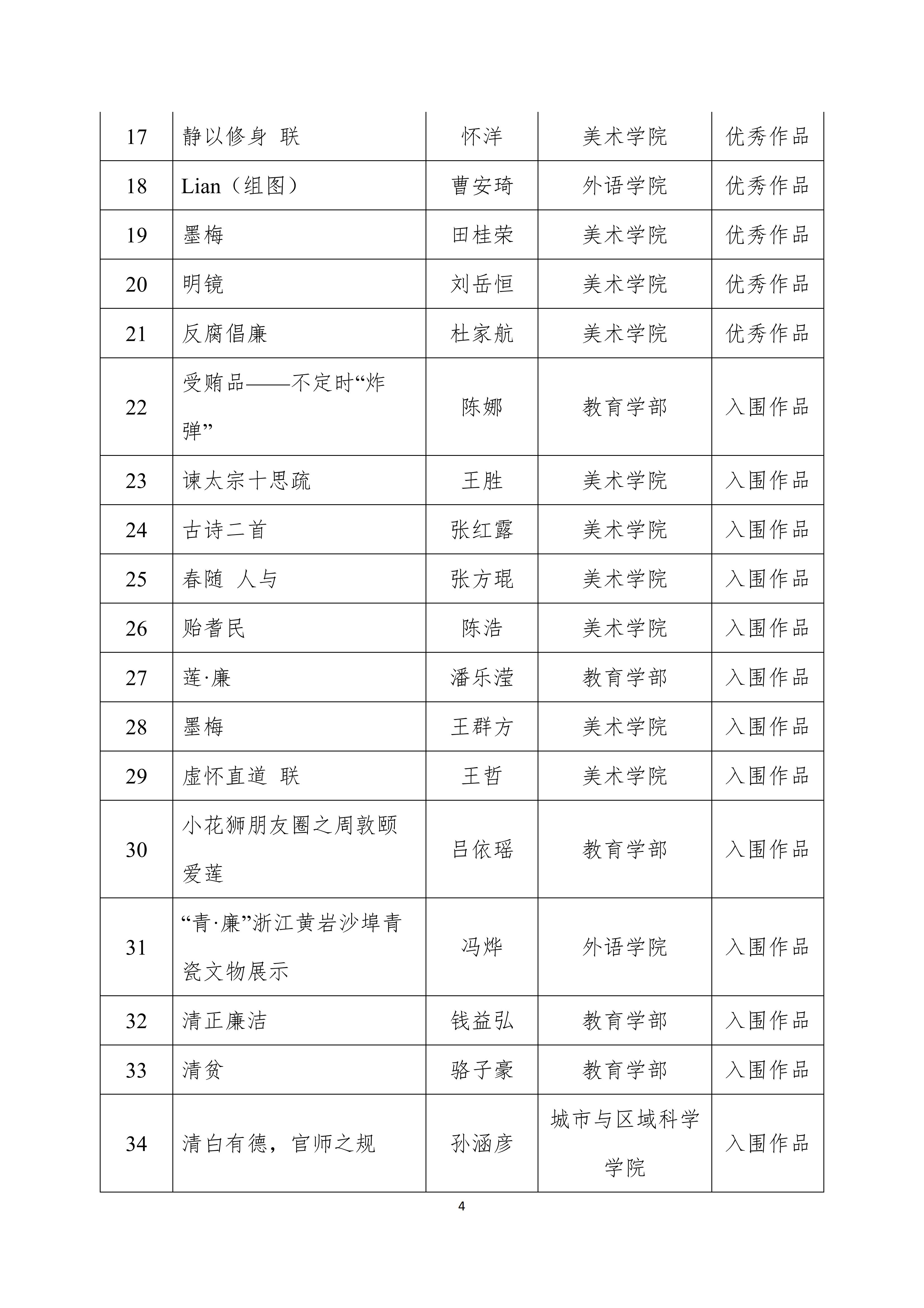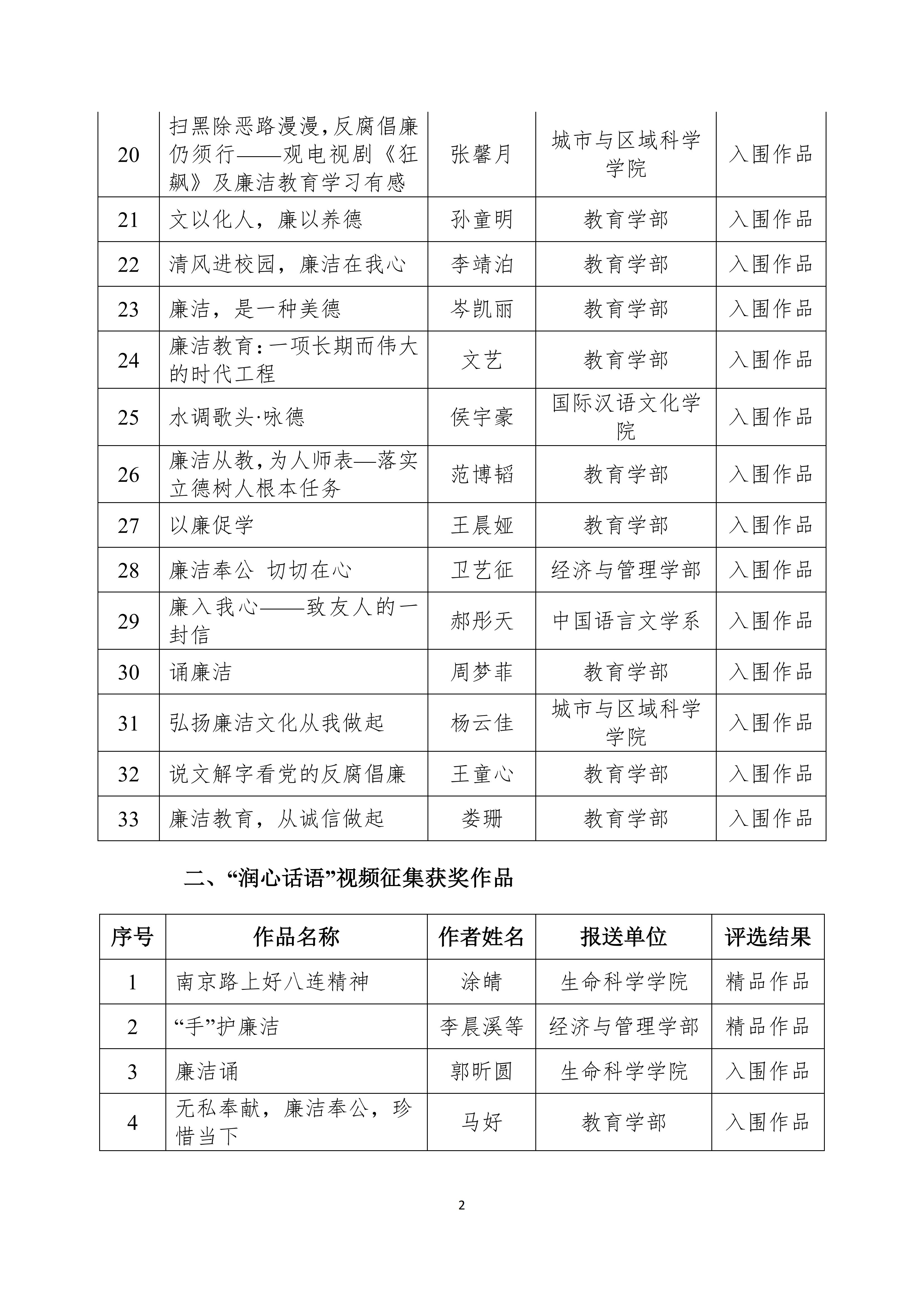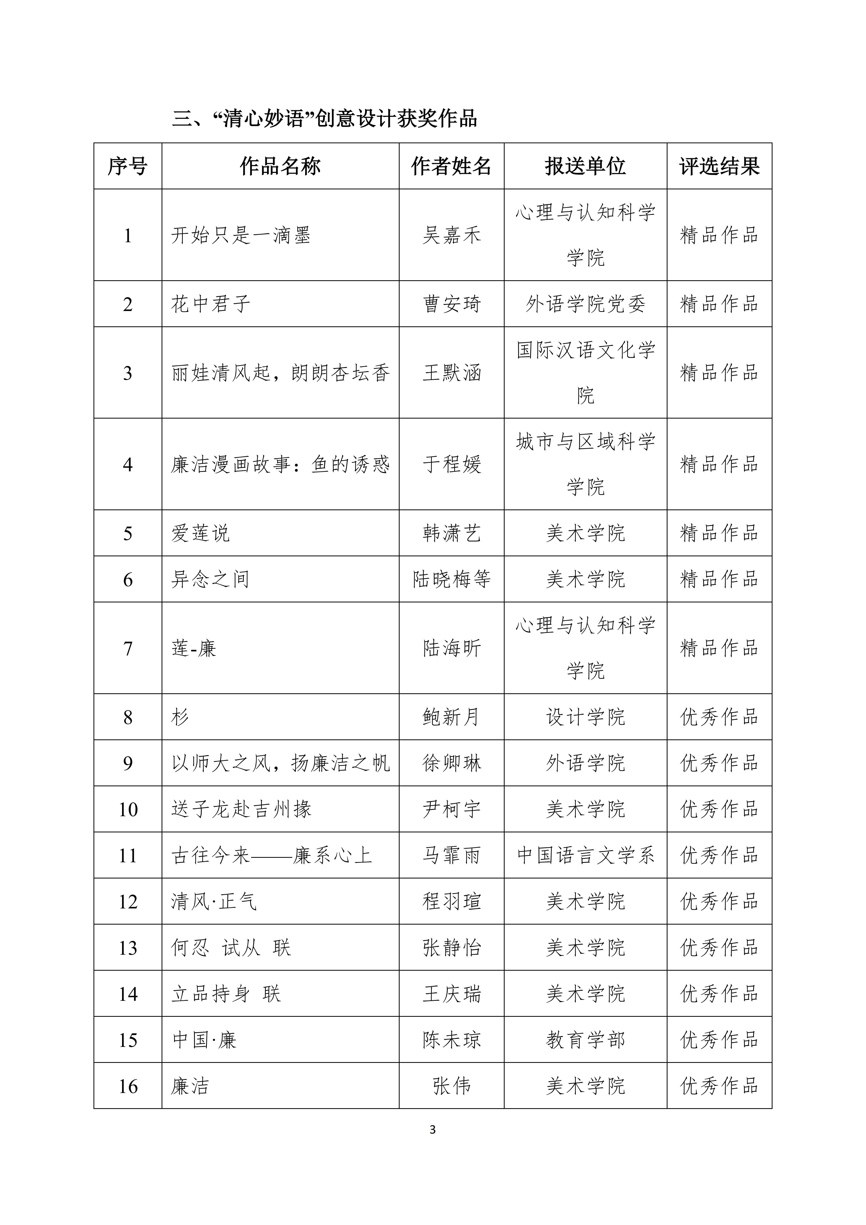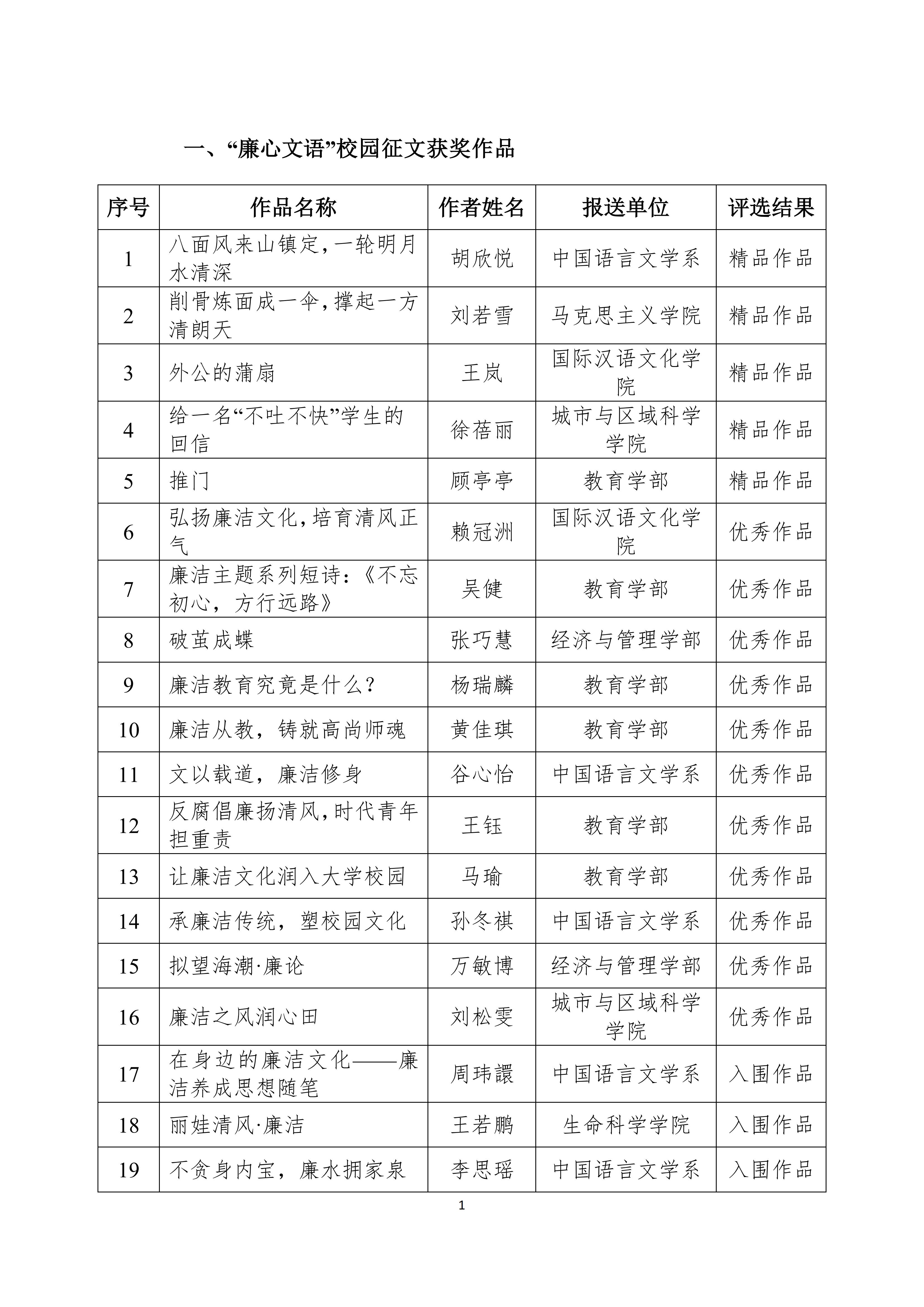 根据《关于举办第二届“丽娃清风”廉洁教育系列活动的通知》(华师纪〔20231号),20231月至4月,学校纪委办公室、党委宣传部面向全校师生开展了第二届“丽娃清风”廉洁文化作品征集评选活动。经师生个人报名、院系级党组织推荐、学校组织专家评审,在“廉心文语”校园征文、“润心话语”视频作品、“清心妙语”创意设计三类作品中,共评选出精品作品14件,优秀作品25件,入围作品39件,优秀组织单位5家。现将评选结果公示(见附件)。