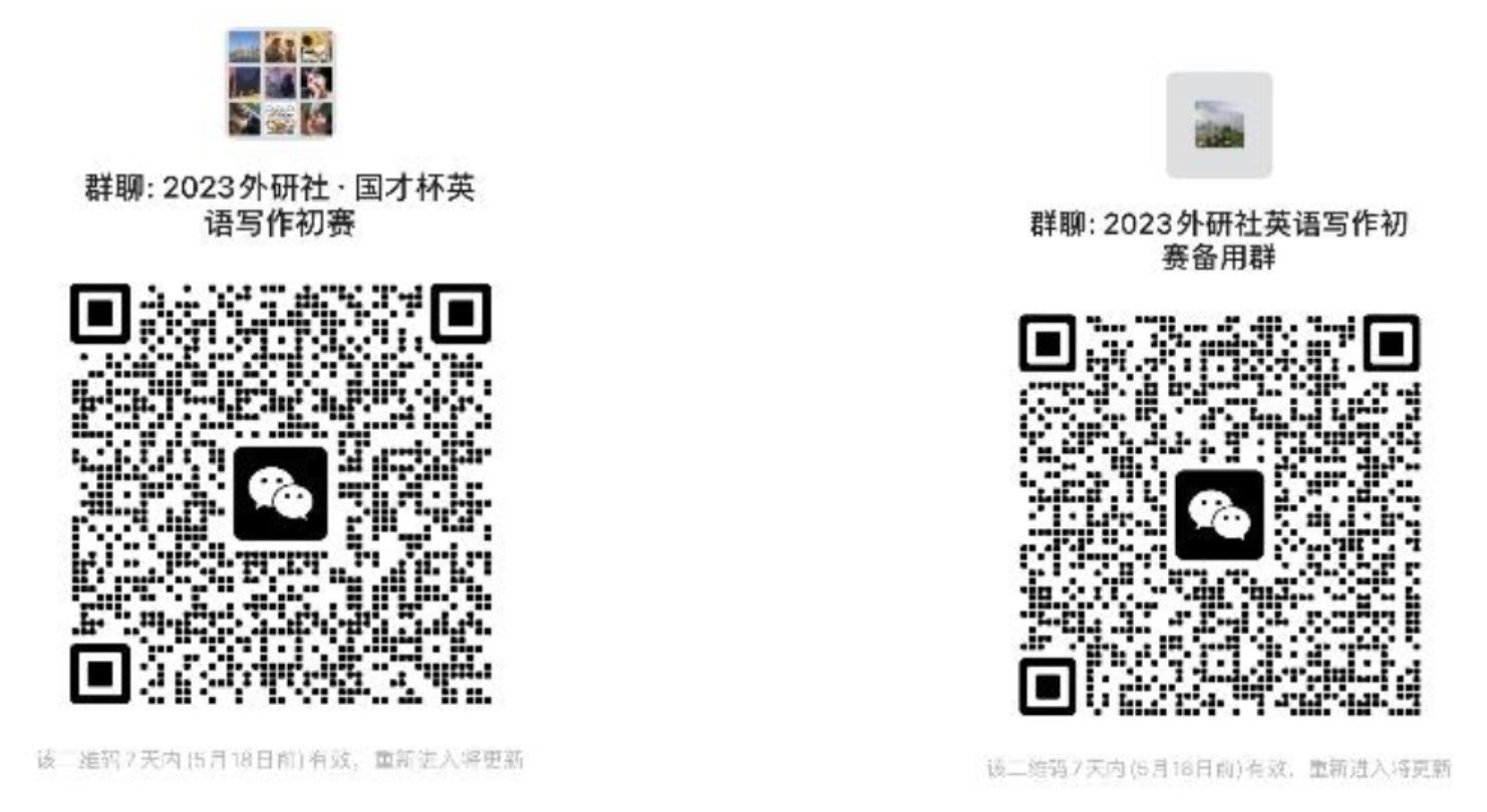 报名微信群:2023外研社ˑ国才杯英语写作初赛(请参赛选手尽快入群,二维码7日内有效,如果群内人数达到上限,请加入初赛备用群,群内按照姓名+学号+院系格式修改昵称)。