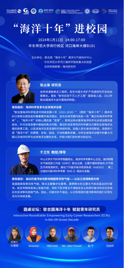 第一期“海洋十年”进校园活动由协作中心联合完美网页版河口海岸学国家重点实验室、联合国“海洋十年”大河三角洲计划和未来地球海岸共同策划和举办,主要面向高校学生和青年教师,包括2场嘉宾讲座和1场圆桌论坛,将为广大师生带来一场生动有趣的头脑风暴。