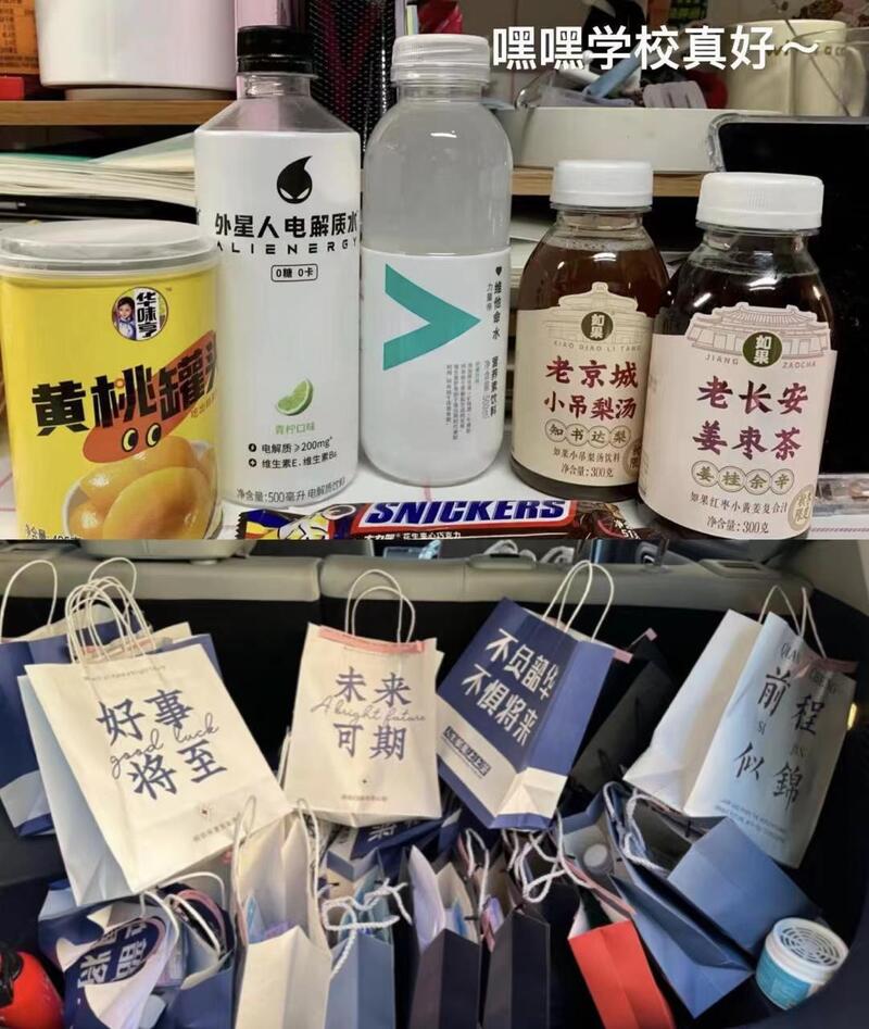 不止黄桃罐头,电解质水、士力架等一件件最IN单品,被装在“好事将至”“前程似锦”的礼包里悄然来到考生身边。开考之前,上海应用技术大学经济与管理学院的考研学子们收到了最温暖的礼物与祝福,“学校真好,我们一定全力以赴。”同样,装着考试文具套装、可乐和橙子的礼包,也被送到上应大理学院考生手中,寓意他们都能“橙”功上岸。考生纷纷表示,学校和老师的关心是最棒“强心剂”。