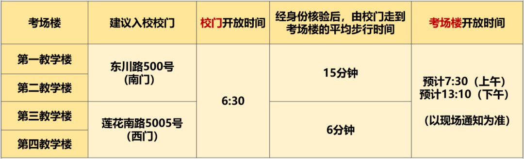 完美网页版在考试当日早6:30起就开放校门,普通考生须佩戴口罩从闵行区东川路500号(南门)或莲花南路5005号(西门)凭本人有效居民身份证原件、核酸报告,经体温测量正常(<37.3°)后进入校园。若两次测量体温≥37.3℃,现场工作人员将安排考生在指定专用的应急考场参加考试。