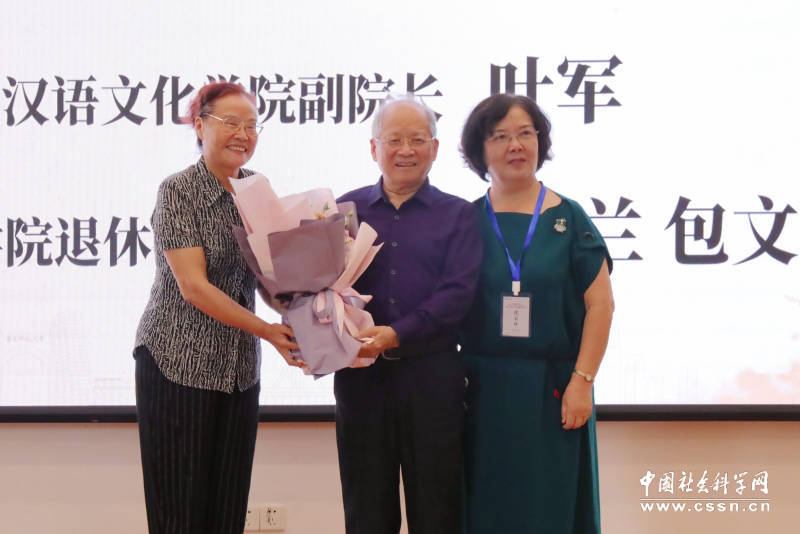 退休教工党支部教师代表刘同兰、包文英献花敬贺并与中国英汉语比较研究会名誉会长、完美网页版终身教授潘文国合影 照片由主办方提供