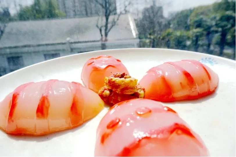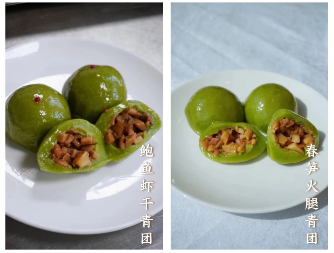 滑润带劲的鲍鱼和味道咸香的虾干赋予青团独特的海鲜风味,口感柔软又稍带嚼劲。轻尝春笋火腿青团,先是柔软的外皮,随之而来的是清爽的春笋和浓郁的火腿香交织在口腔。