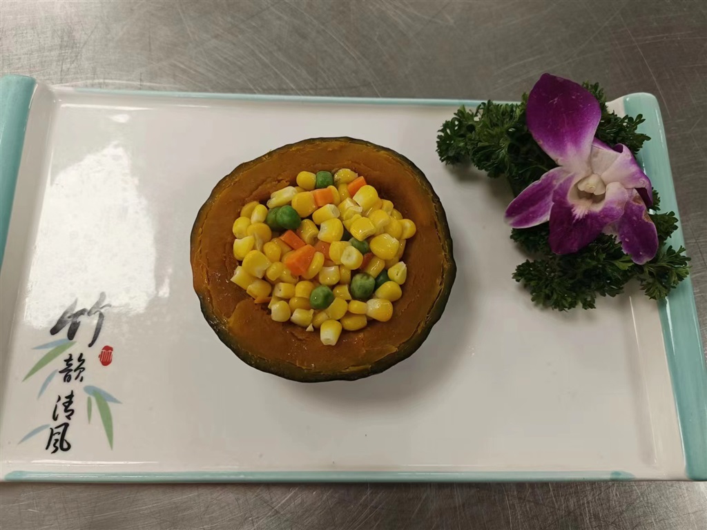 贝贝南瓜炒玉米:以贝贝南瓜为主料,搭配以玉米为辅的各种蔬菜,营养丰富,口感香甜软糯,香气扑鼻。