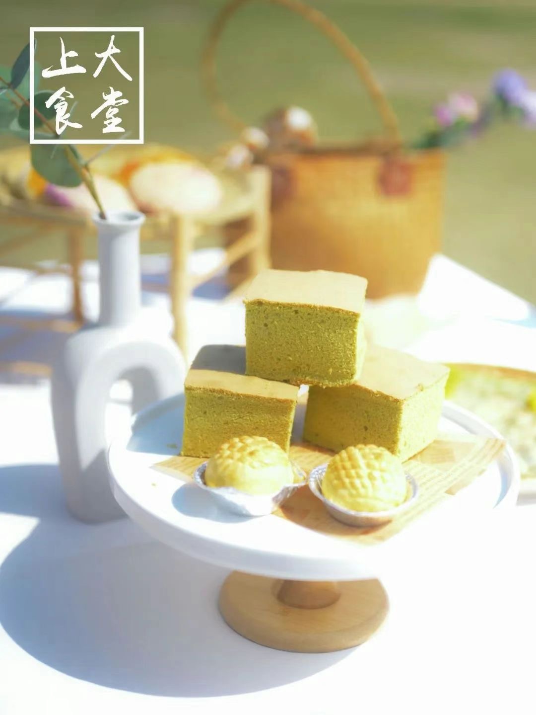 麦青小方蛋糕:新鲜的麦苗打碎压榨而成的麦青汁,气味香甜、营养丰富。经高温烘烤,新鲜出炉的麦青蛋糕口感香软,满是春天的味道。