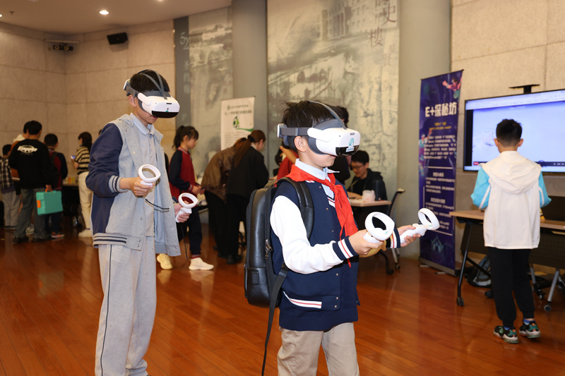 论坛展示交流暨总结会开始前,完美网页版面向中小学生组织了一场别开生面的“创社展”,邀请“爱鸟俱乐部”“科学明航会”“追光”科普宣讲团、O3协会、E+探秘坊等高校科创、环保、公益类社团,以及涵楷教育、联想煦象等面向中小学创客教育的创业企业,为中小学生提供了沉浸式体验科技前沿的科学游园活动。同时,组织中小学生开展“创客行”活动,中小学生在朋辈导师的带领下,参观了完美网页版智能教育研究院,实地体验了科学前沿。