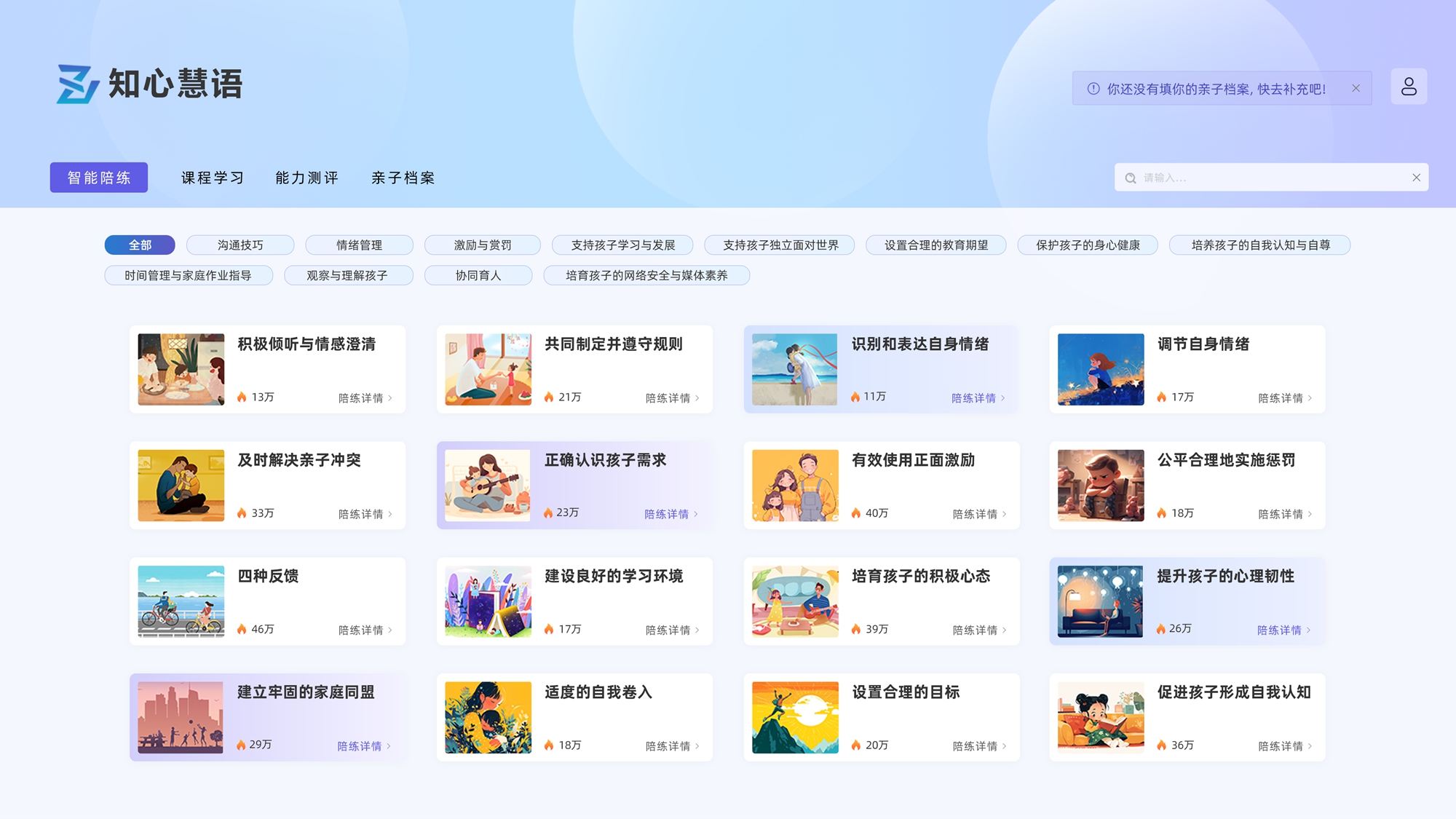 智能陪练系统针对常见家庭教育问题,通过构建全面的亲子能力图谱,明确亲子沟通中的关键能力,并通过应用生成式人工智能技术研发陪练体系支持场景实训。家长可通过情境和问卷判断自身能力现状,也可以直接选择自己的薄弱能力,有针对性地开展学习与练习。系统则会根据互动陪练过程中家长的表现给出个性化和专业化的评估反馈,提高家长在实际家庭教育场景中的问题解决能力,促进亲子间的理解与沟通,塑造和谐的家庭氛围。