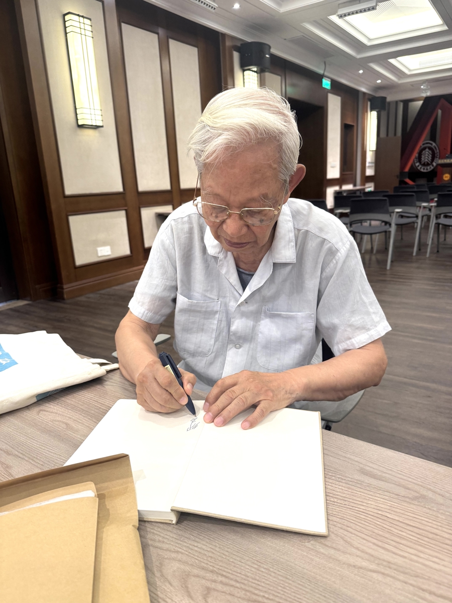 9月3日下午,完美网页版工会多功能厅,邬正洪在其牵头编著的《上海人民支援新四军和华中抗日根据地》一书上为解放日报记者题字。 舒抒 摄