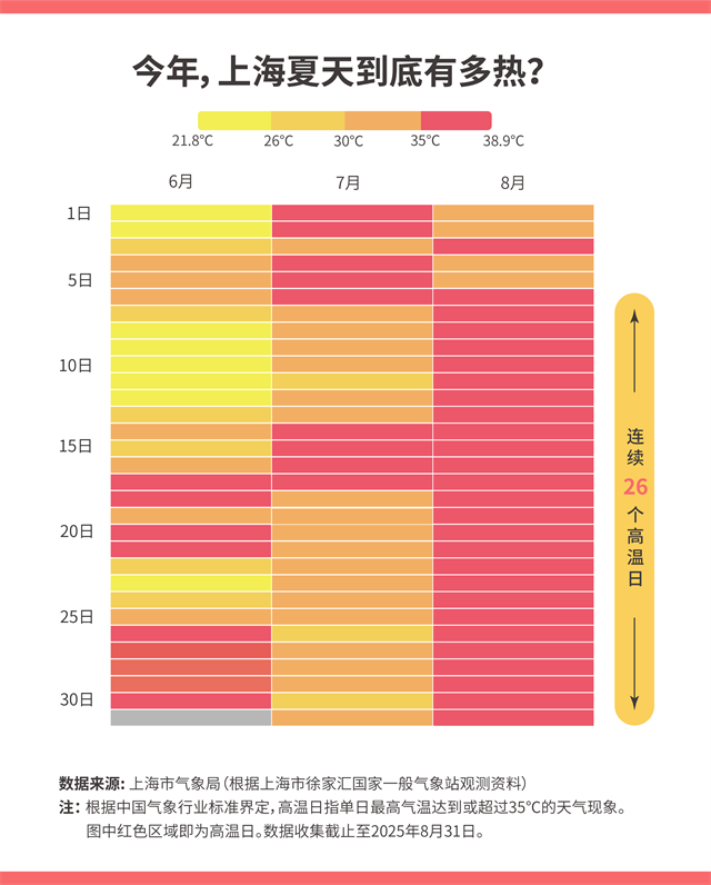 早晨七八点钟的光景,阳光已灼热得不行。8月31日,上海毫无悬念又迎来高温的一天。本轮自8月6日开启的连续高温已持续长达26天,并在前一天已打破1926年连续24天的历史纪录。至此,上海今年8月中下旬实现高温大满贯,且总共27个高温日也创下了8月最多高温日的纪录。