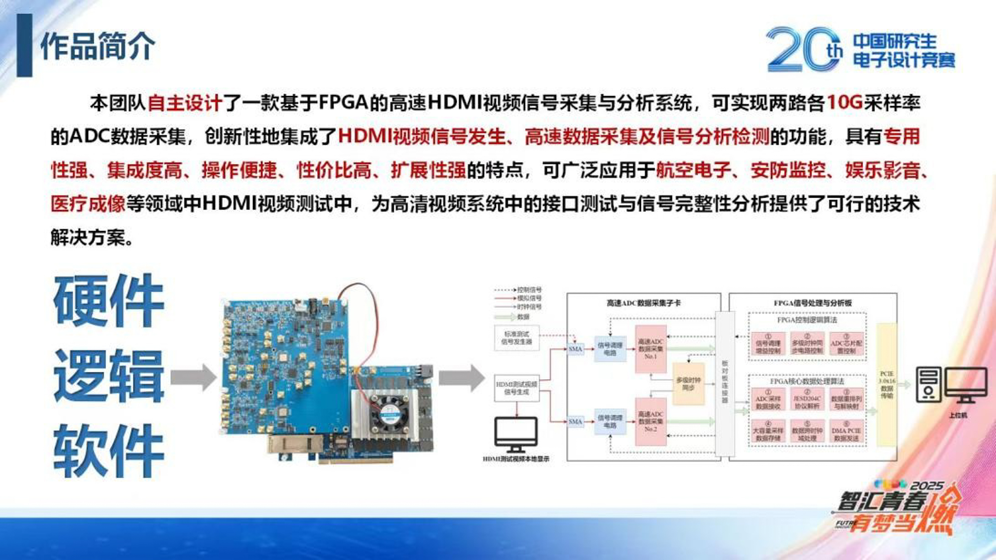 “VQ-TECH”团队自主设计了一款基于FPGA的高速HDMI视频信号采集与分析系统,可实现两路各10G采样率的ADC数据采集,创新性地集成了HDMI视频信号发生、高速数据采集、信号分析检测三大功能,具有专用性强、集成度高、操作便捷、性价比高、扩展性强五大特点,可广泛应用于航空电子、安防监控、娱乐影音、医疗成像等领域中的HDMI视频测试中,为高清视频系统中的接口测试与信号完整性分析提供了可行的技术解决方案。