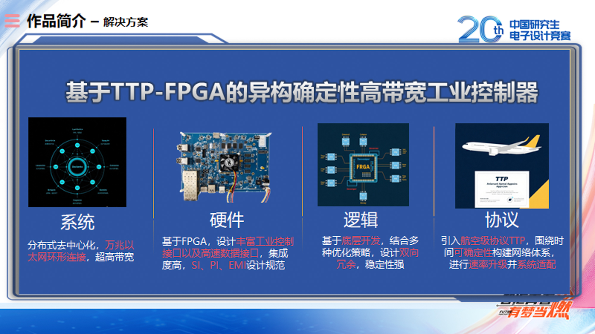 “凌工智控”团队针对传统工业控制系统实时性不足、协议异构、扩展性差等痛点,提出了一套高安全性、高带宽、时间可确定的控制系统,自主研发16层硬件控制器、优化航空级TTP协议,实现了10Gbps高速可确定性通信,支持数十路高清视频同步传输和上百个工业设备实时控制,为工业控制从“能联”到“智能协同”提供了自主可控的解决方案。
