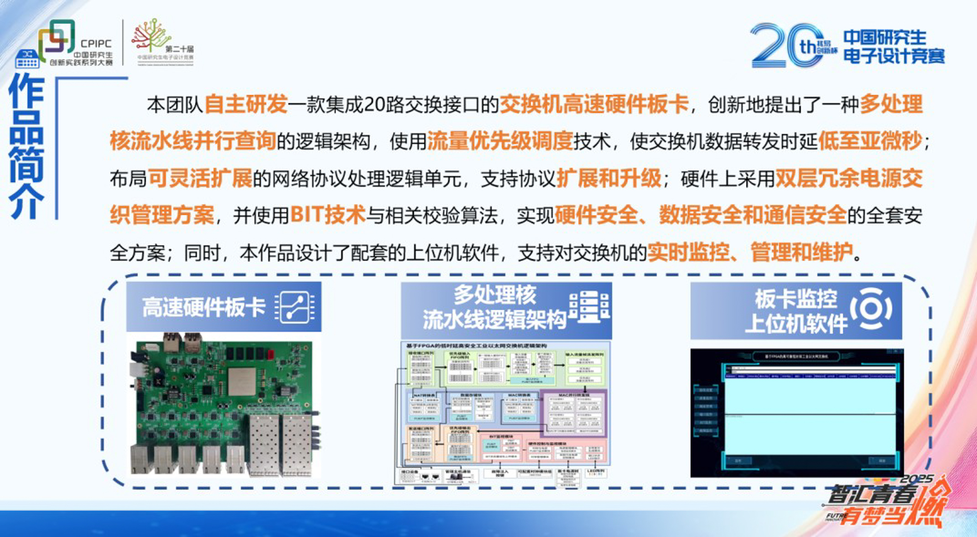 “脉向芯帧成”团队主要针对当前交换机在实时性、高安全传输两个方面的需求,开发出一套硬件逻辑安全方案,创新性提出逻辑多处理核流水线并行查询的逻辑架构。该架构将数据转发时延降至0.77us,同时支持硬件状态上报,可实现提前预警,有效保障系统安全运行。