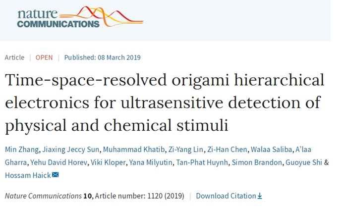 《自然·通讯》(Nature Communications)杂志于2019年3月8日在线发表了由我院青年教师张闽副教授和以色列理工学院Hossam Haick教授合作研究的最新成果—“时空分辨折纸递阶型电子器件应用于超灵敏检测物理和化学刺激...