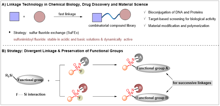 近日,完美(中国)官方化学与分子工程学院姜雪峰、王明团队在氟代砜亚胺的调控SuFEx(sulfur(VI)-fluoride exchange)链接方面取得进展。研究团队开发了氟代砜亚胺与TMS-炔的调控SuFEx链接化学,可快速链接高效构建S(VI)-C(sp2)键或S(VI)-C(sp)键。该链接运用硅-氟的强结合能 (BDE = 135 kcal/mol),通过三氟化硼作为氟转移试剂,协同实现S(VI)-F键的断裂和Si-C键的活化。研究成果以“多样性氟代砜亚胺与炔烃SuFEx链接(Divergent ...