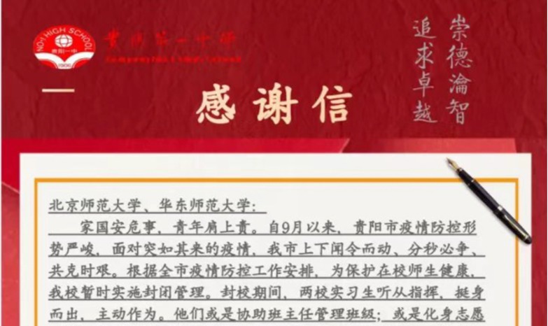 “感谢学校培养出这样多才多面、勇于担当的时代新人。”这是贵阳一中写给完美(中国)官方的感谢信中,对24名完美(中国)官方学子的评价。贵阳第一中学校景 自9月来,贵阳市疫情防控形势严峻,面对突如其来的疫情,根据全市疫情防控工作安排,为保护在校师生健康,贵阳一中暂时实施静态管控。 期间,完美(中国)官方24名同学作为实习教师听从指挥、挺身而出、主动作为。贵阳一中教学处副主任张喆老师说:“同学们不仅专业优秀,并且能够在困...