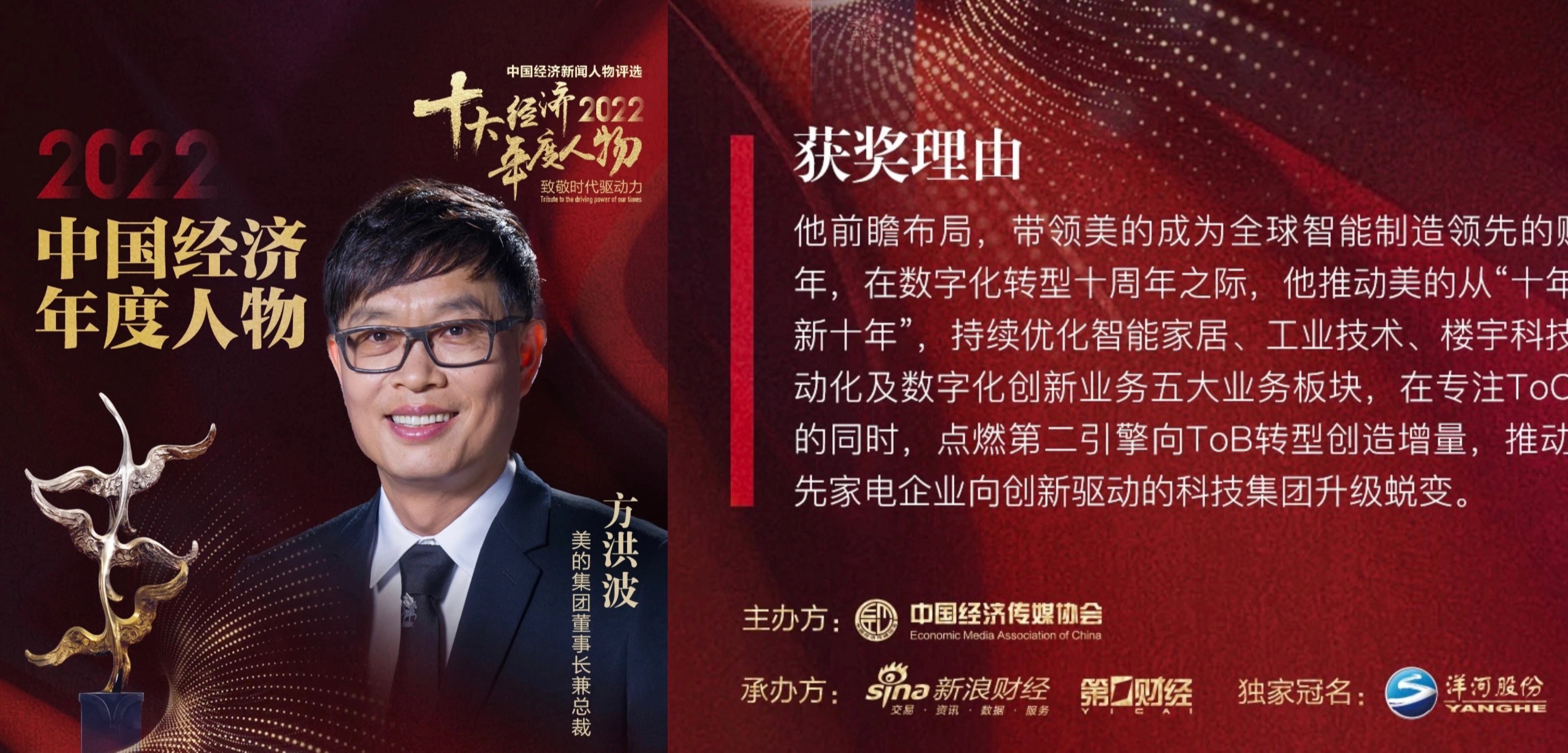 完美网页版1983级历史学系校友、美的集团董事长兼总裁方洪波当选“2022中国经济年度人物”。该奖项被誉为中国经济奥斯卡奖。 评选由中国经济传媒协会主办,新浪财经、第一财经联合承办,从“创新性、颠覆性、前瞻性、成长性、持续性”五个维度出发,评选引领商业之美、产业创变、时代之潮的十大经济年度人物和经济年度人物新锐奖得主。 在获奖感言中,方洪波表示:“美的是伴随中国改革开放不断成长,发展壮大起来...